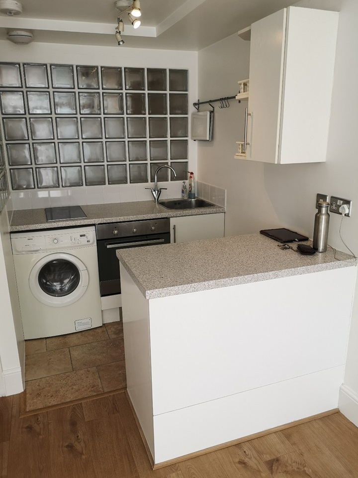 This ground floor apartment faces South, making it light and breezy in the open plan kitchen and living room. It has a bathroom to the rear and a double bedroom. It has an outdoor terrace to BBQ.