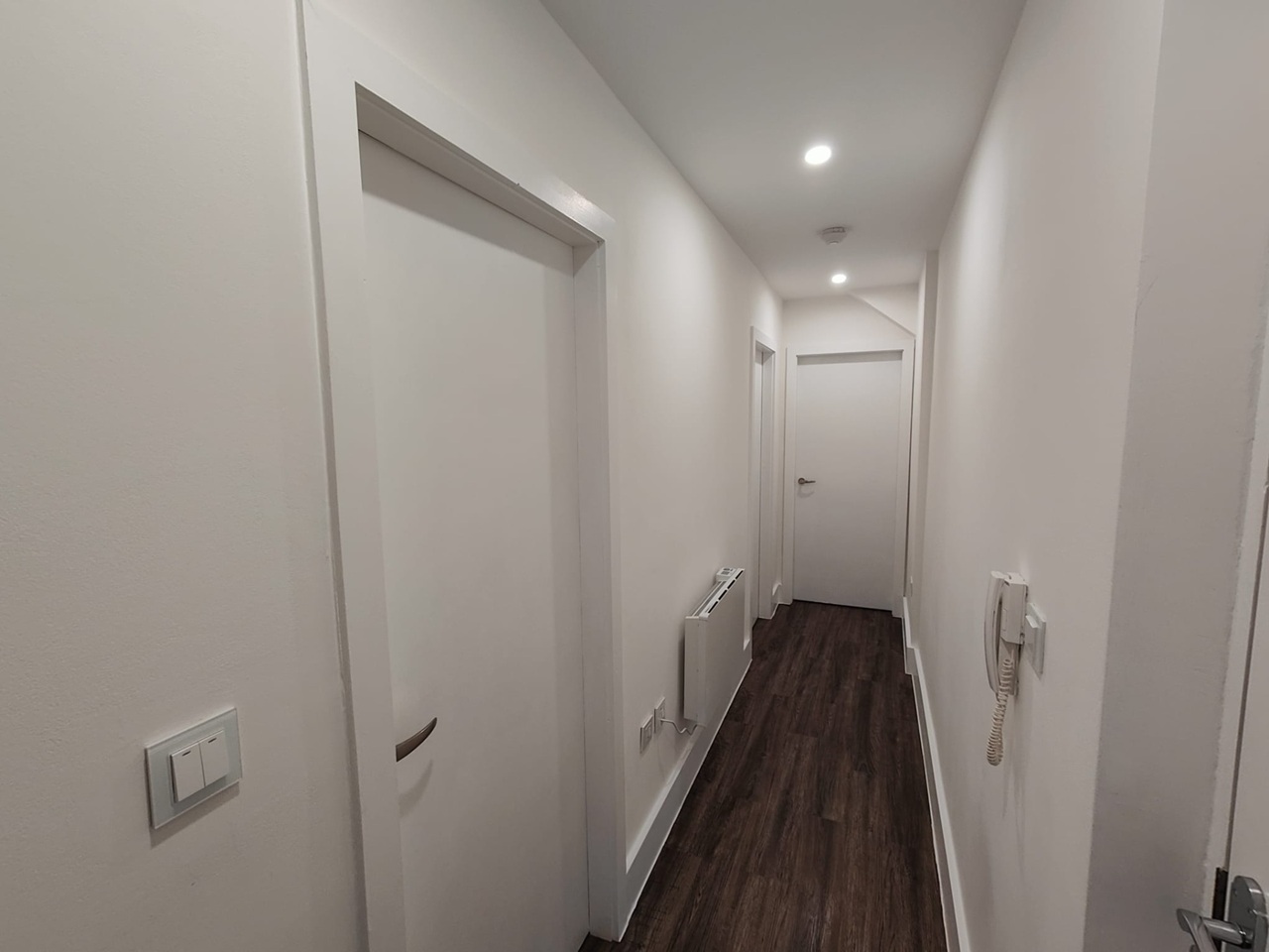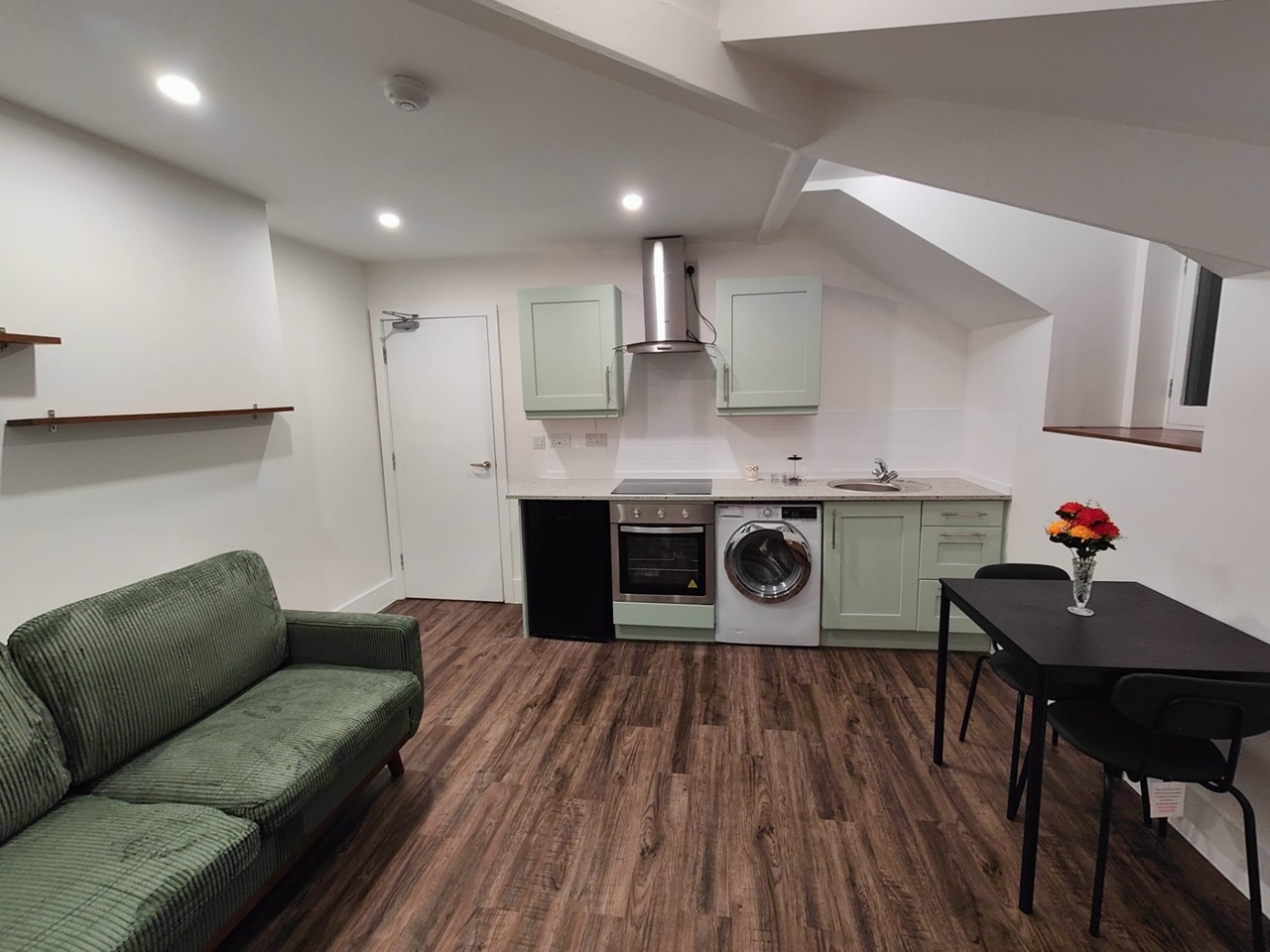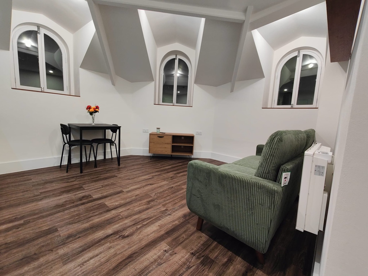 Bright open-plan living space with new flooring, neutral décor and LED lighting