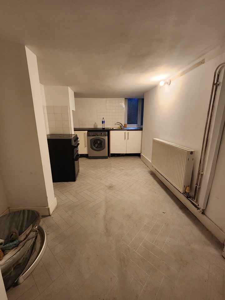 The home has an open-plan kitchen and living room, along with two bedrooms and a bathroom. There is also a basement with an extra room, which was previously used as a bedroom, plus a second kitchen.