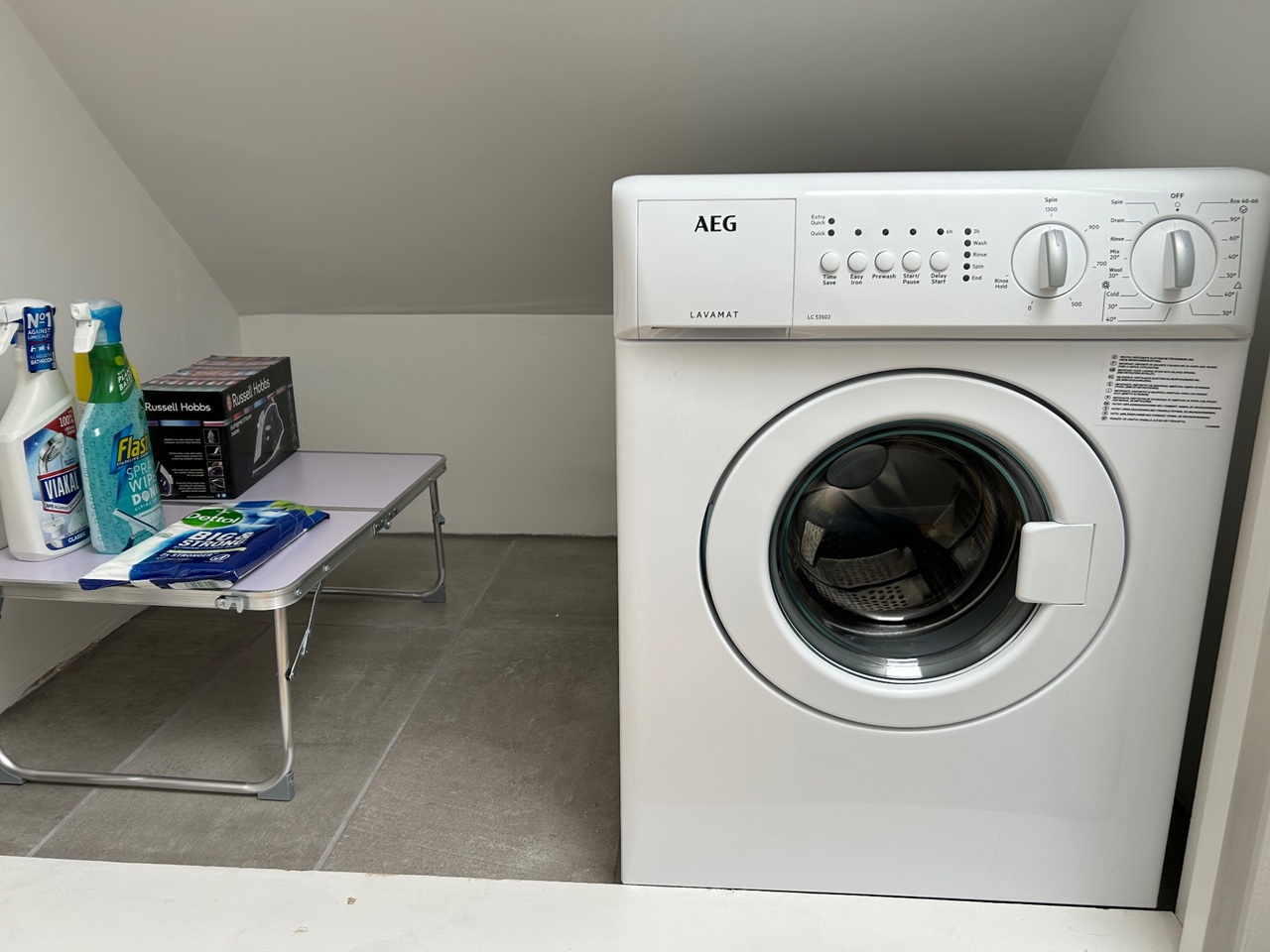 Tiled utility with washing machine, iron, ironing board, clothes dryer, Free starter pack of cleaning materials.