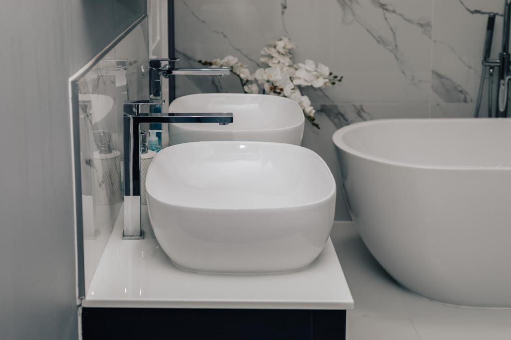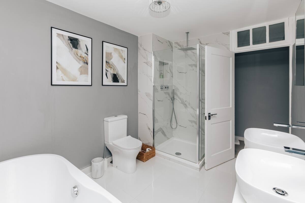 Stylish main bathroom boasting shower and freestanding bath tub.