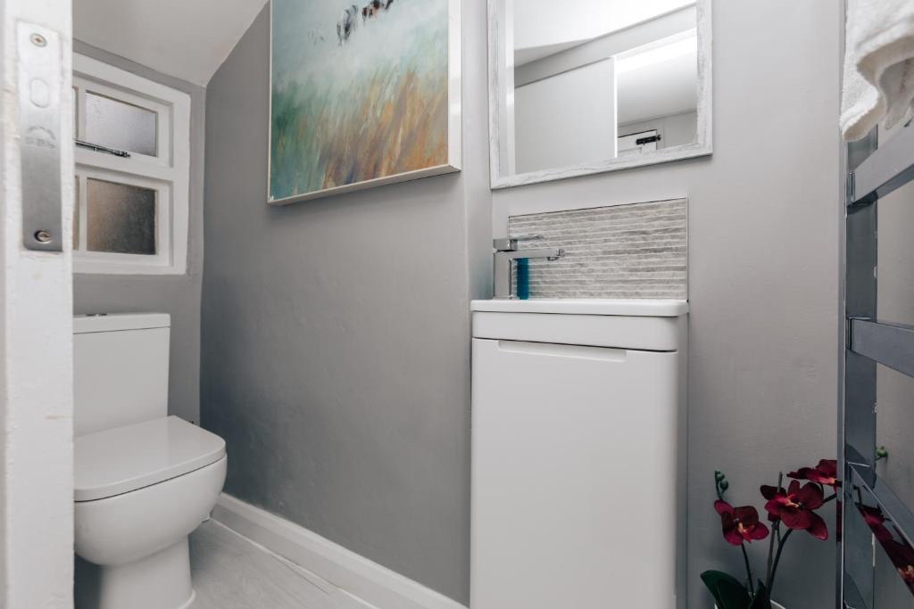 Spacious utility room with washer dryer and modern WC.