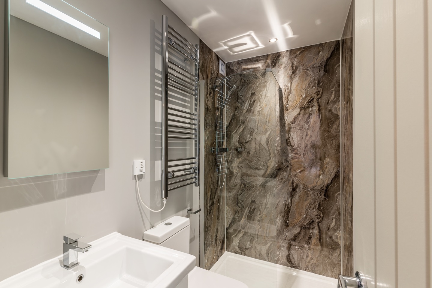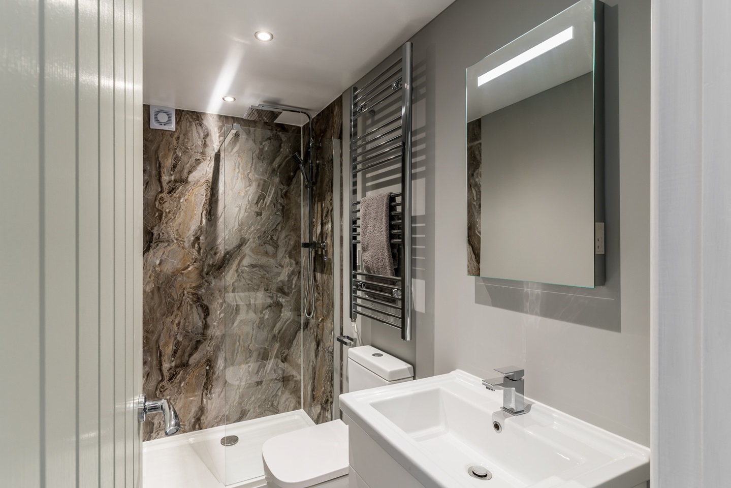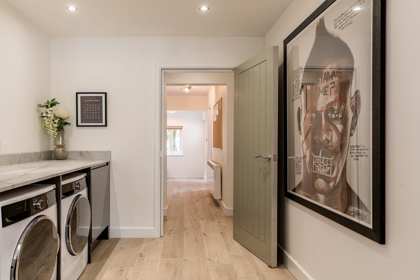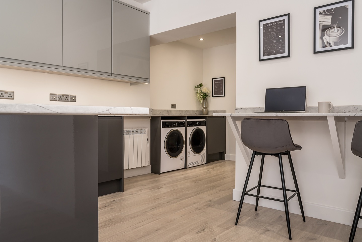 - Washing machine, tumble dryer, dishwasher, 2 x combi microwaves, induction hob and oven for shared use