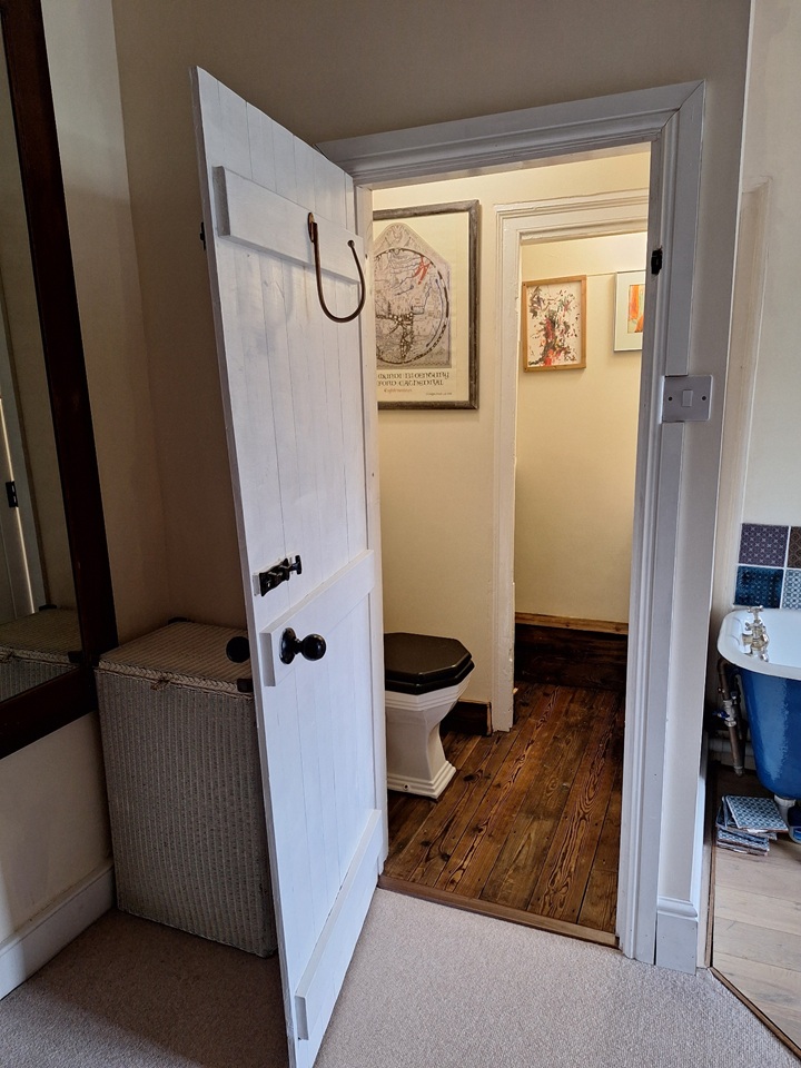 The main bathroom has a shower and loo and is located downstairs and there is a further loo and bath in the main bedroom.
