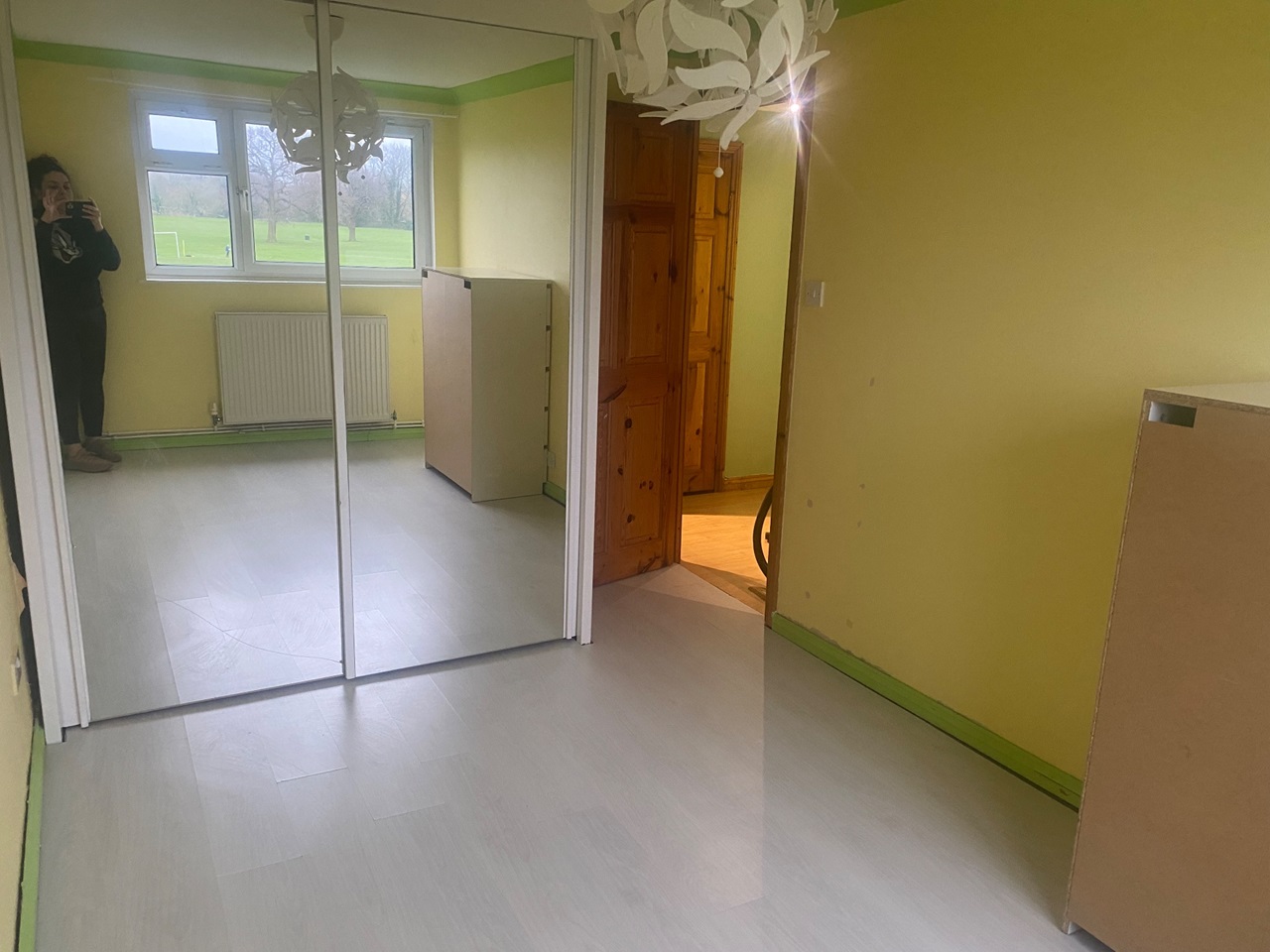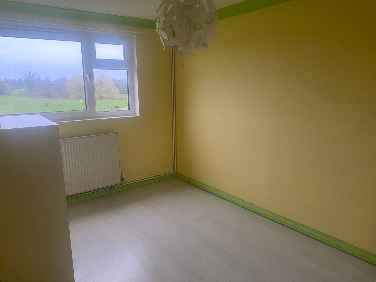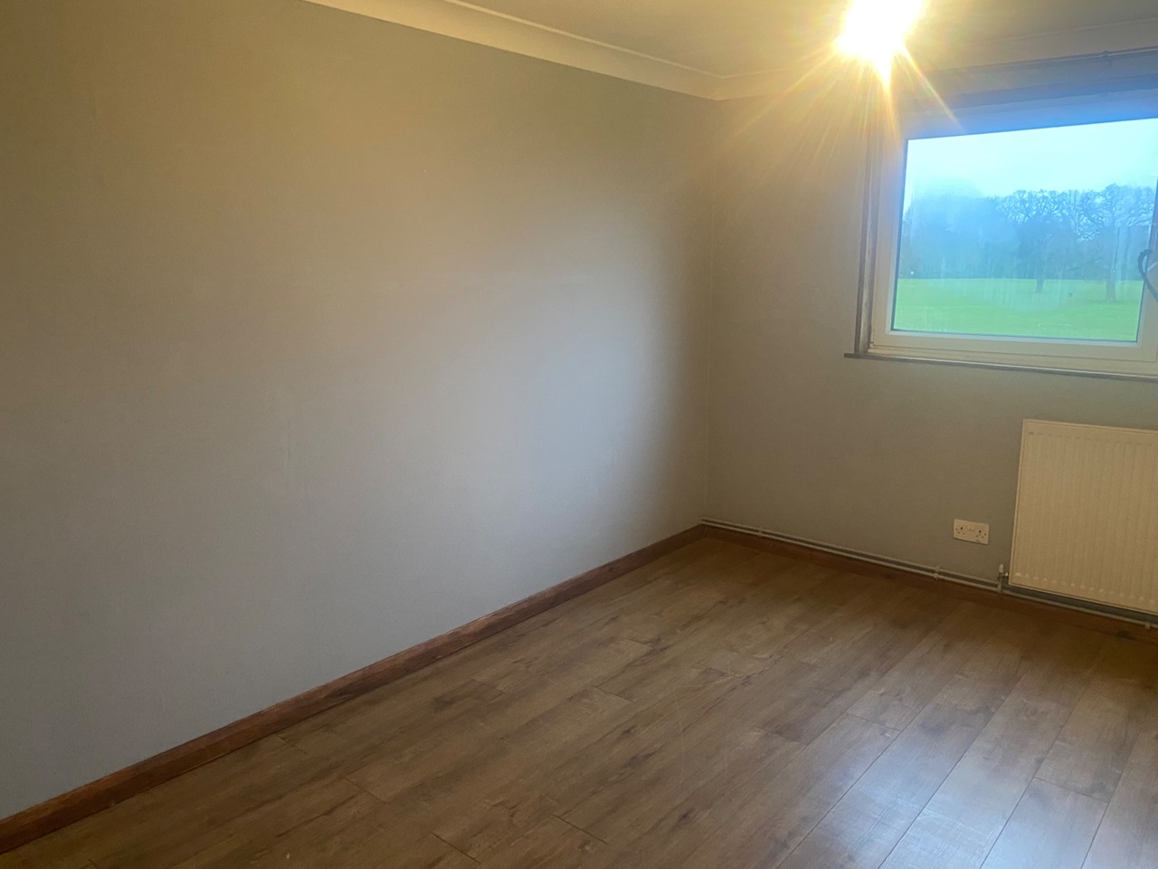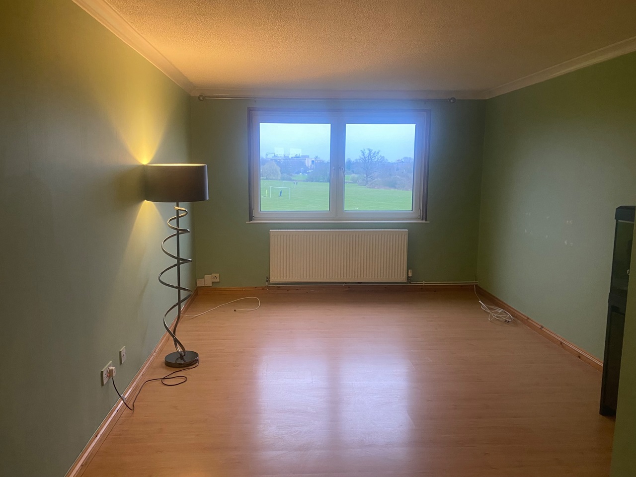 The living room is very generous in size with a large window bring in loads of natural light and overlooking the lush green park of Court Lodge Fields.