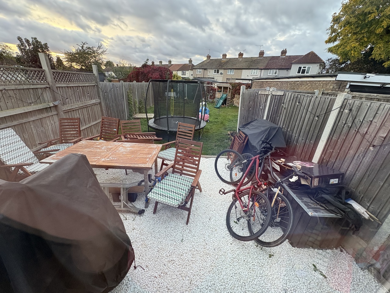 Garden has a large patio with an 8 person dining set, gas barbecue, large storage shed, children's swing and slide.