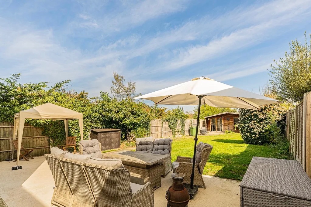 Externally the beautifully presented property boasts a carriage driveway, offering parking for multiple cars. To the rear a large garden, with both patio and lawn areas, offers a lovely place to enjoy al fresco meals and outdoor recreation. This generous space also currently features an outbuilding with built in bar, perfect for socialising with friends and family.