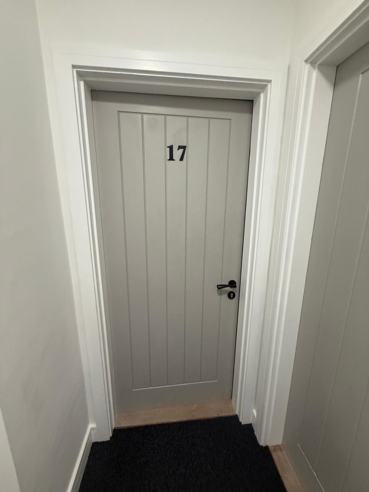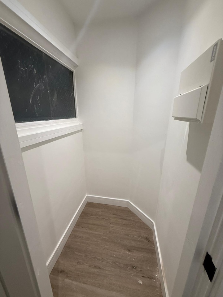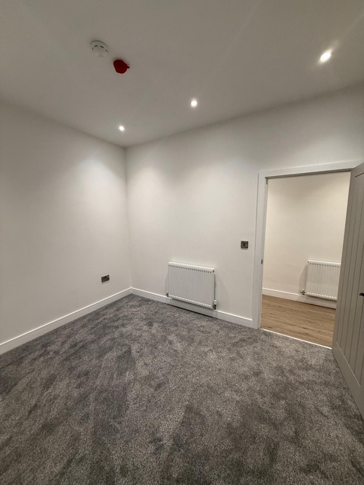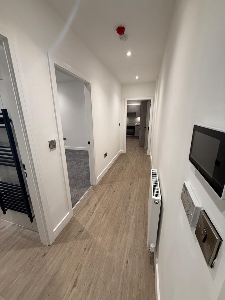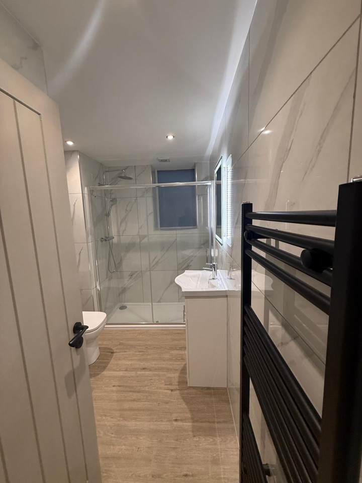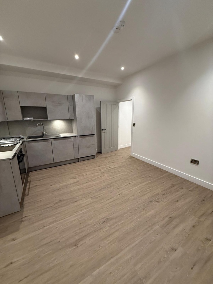 From the moment you enter, you are greeted by a bright, clean aesthetic, with stylish wood-effect flooring running through the hallway and into the open-plan living space. The brand-new kitchen is a contemporary centerpiece, featuring sleek, concrete-effect cabinetry and integrated appliances, all set against fresh white walls and illuminated by modern recessed spotlights.