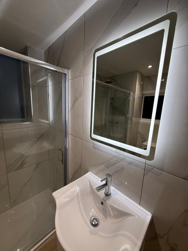 The bathroom is a true showcase of luxury, fully tiled with a chic, light-grey marble-effect. It features a high-end, walk-in shower with both a rainfall head and a handheld attachment, a modern pedestal sink, a large backlit LED mirror, and a statement-making black heated towel rail.