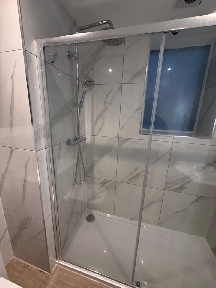 - Luxury bathroom featuring floor-to-ceiling marble-effect tiles