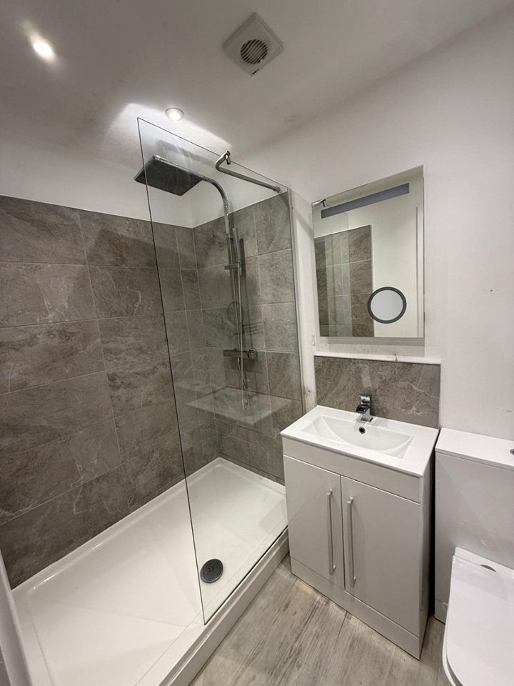 Luxury Bathroom: Contemporary fully tiled suite featuring a large walk-in rainfall shower and LED vanity mirror.