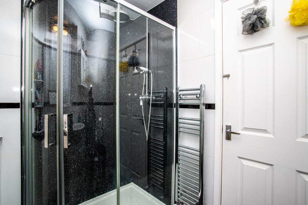 The bright, stylish, fully-tiled shower-room boasts a powerful, mains-fed Drench shower [with hand-held device], in a modern quadrant cubicle. An extractor fan is a useful addition. Loo rolls are part of the 'welcome to your new home' pack. Hands-free lever taps, ladder radiator, mirrors & storage completes this inviting space. Yes, the door has a lock!
