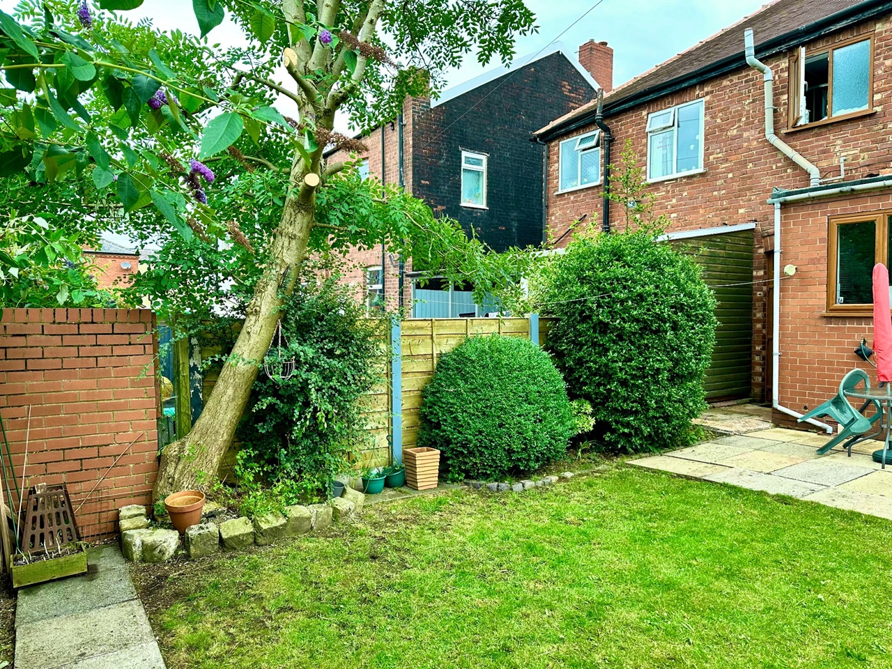 The iron-gated secure rear garden [as shown] has seating, mature trees, birdlife, shrubs, a flagged patio and neat lawn for play, relaxing, or entertaining. Made possible because of PIR lighting, a brazier & outdoor power sockets. A hosepipe is useful for washing bikes, dirty boots, or for filling a paddling pool on hot days.