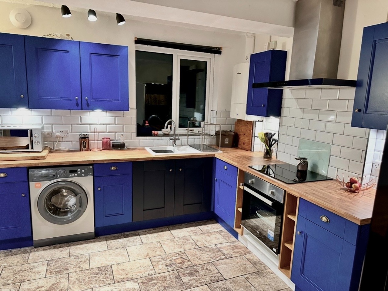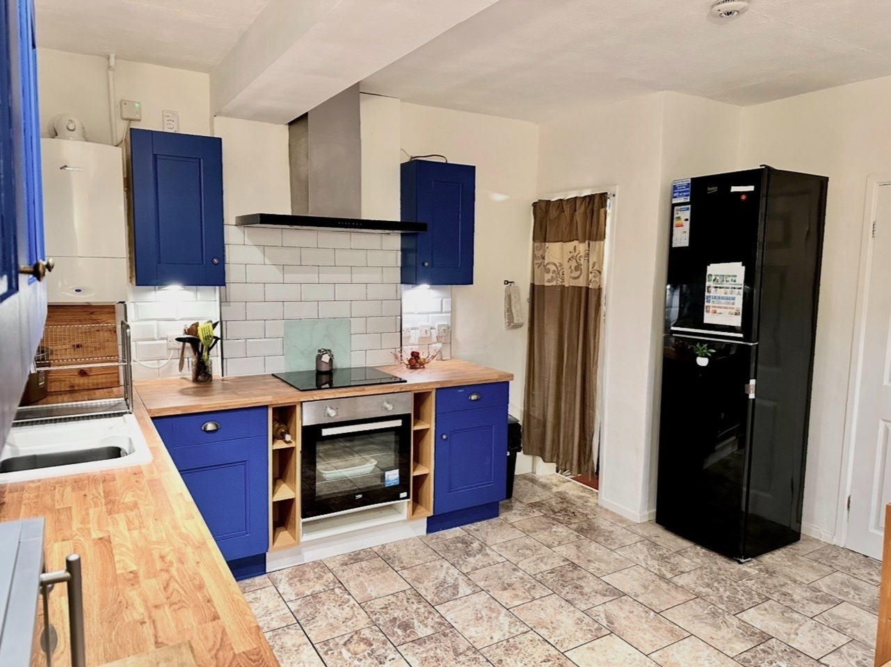 - 'A'-rated' unmarked kitchen appliances are provided. E.g; WM, tall F/F, electric oven/hob, extractor chimney, kettle, toaster, m/wave..