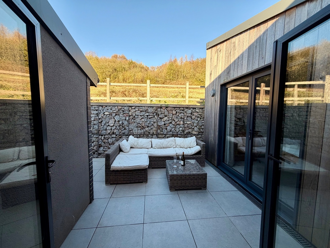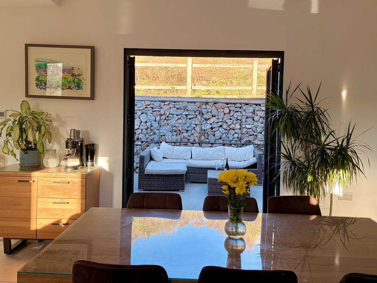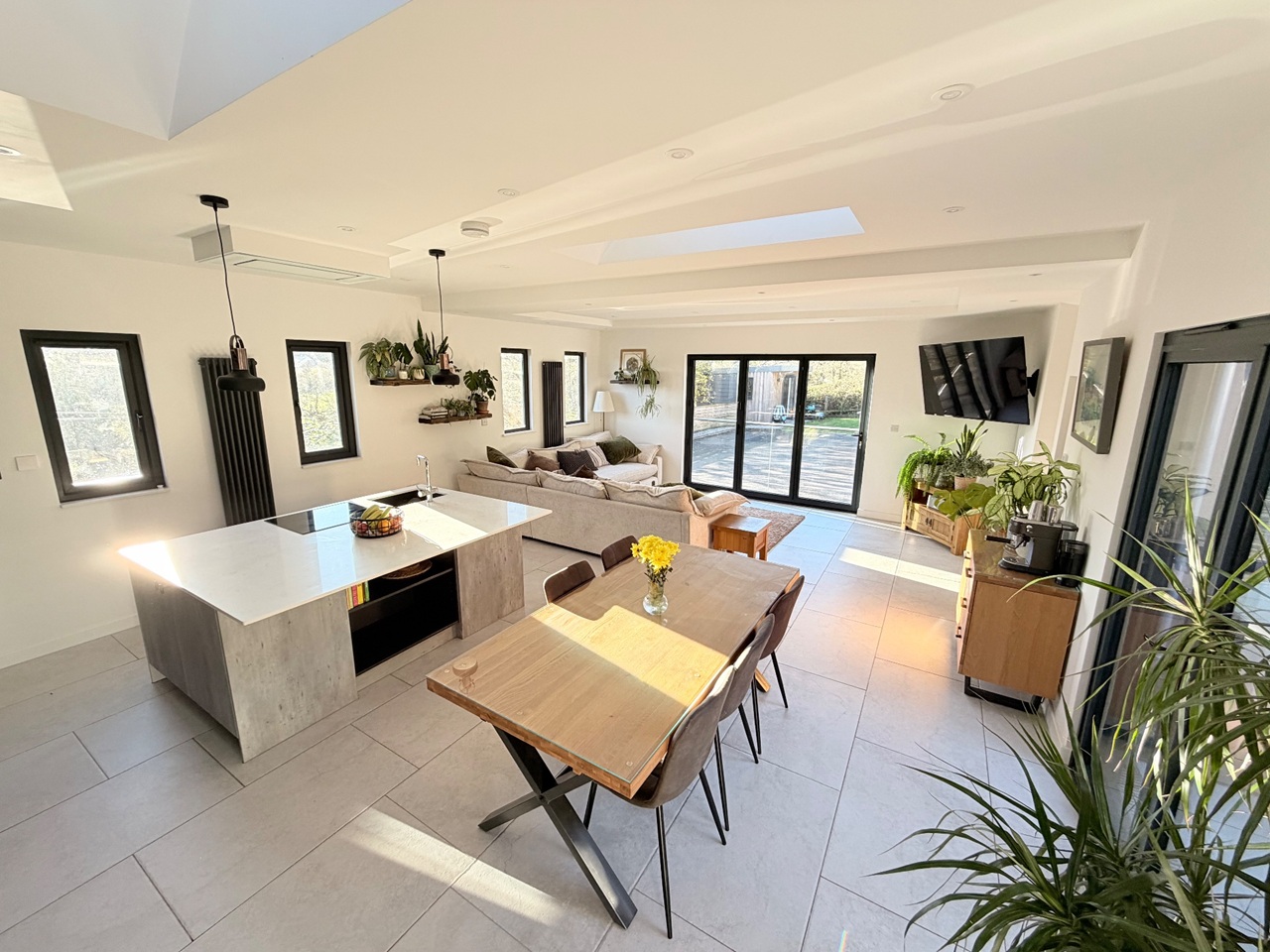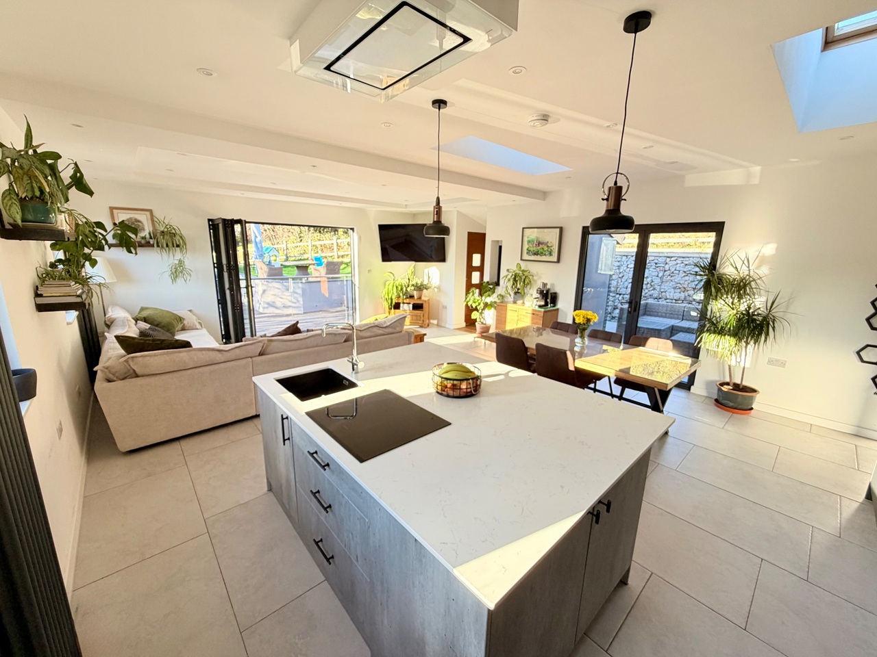 The heart of the home is the spacious open-plan kitchen, dining and living area, featuring a large central island, modern integrated appliances, skylights, and bi-fold doors opening directly onto the private terrace and garden — perfect for entertaining and indoor-outdoor living.