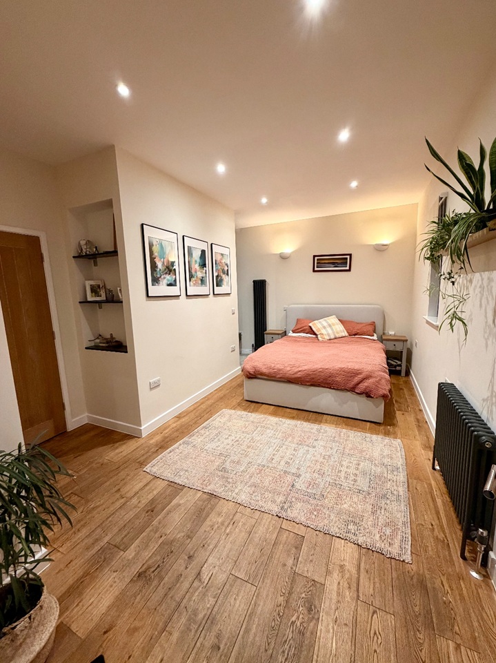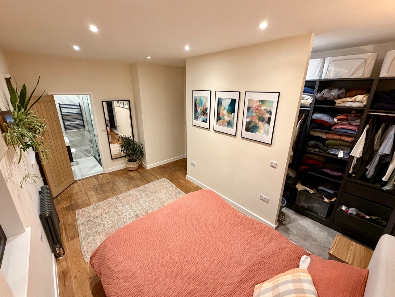 The property offers four well-proportioned bedrooms, including a generous principal bedroom with walk-in wardrobe and en-suite shower room, two further double bedrooms, and a fourth bedroom ideal as a guest room, home office or study. A sleek family bathroom serves the remaining bedrooms.