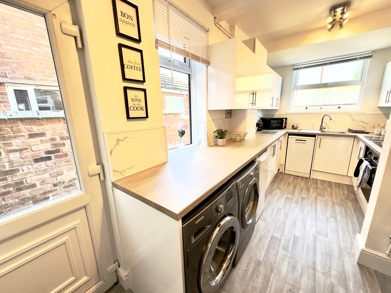 Sleek high-gloss cabinetry and wood-effect worktops