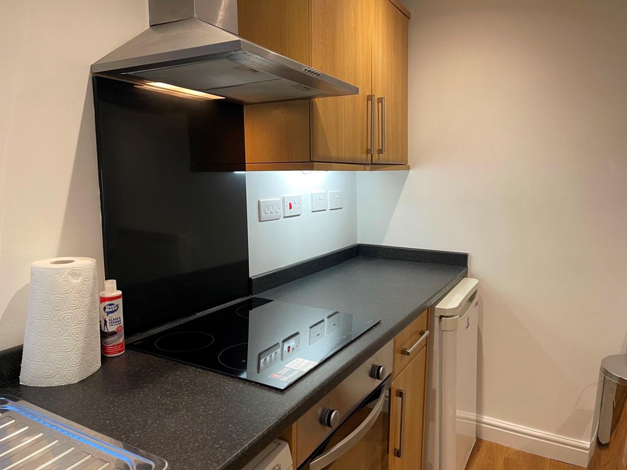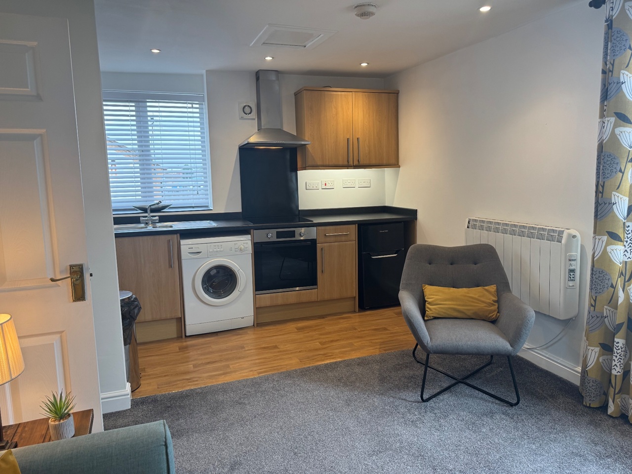 Kitchen /lounge . Kitchen fitted with a howdens kitchen,fan assisted oven & new touch control ceramic hob. It has LED down lights above & LED under counter lights.White not included.