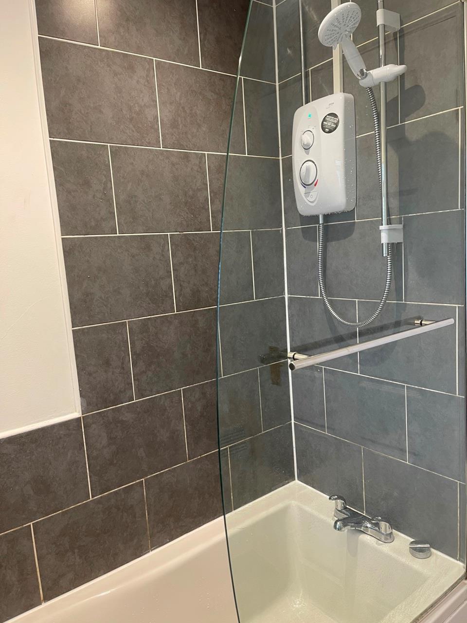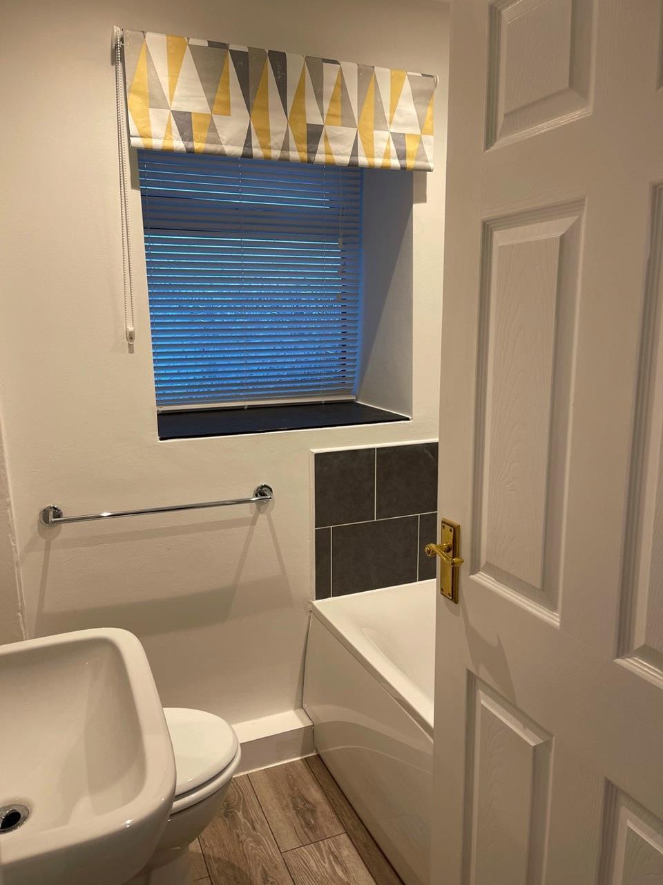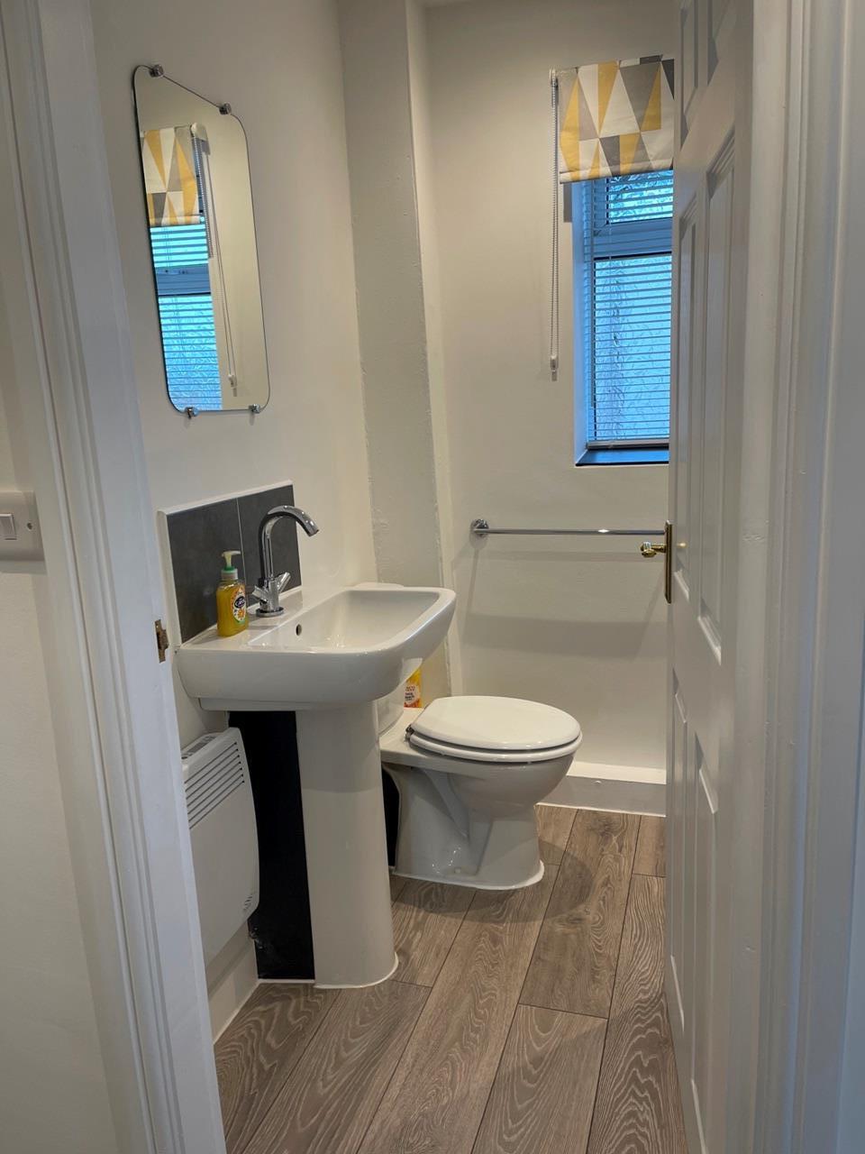 Bathroom with fan & LED down lights.Mira shower over bath,toilet,& sink & laminate floor.