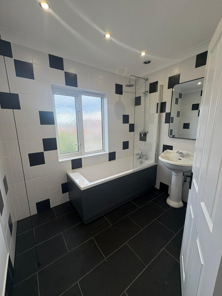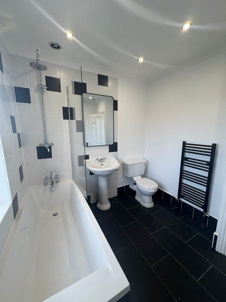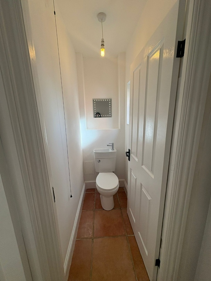 Upstairs bathroom with stylish suite and shower bath, separate downstairs toilet and under stair storage.