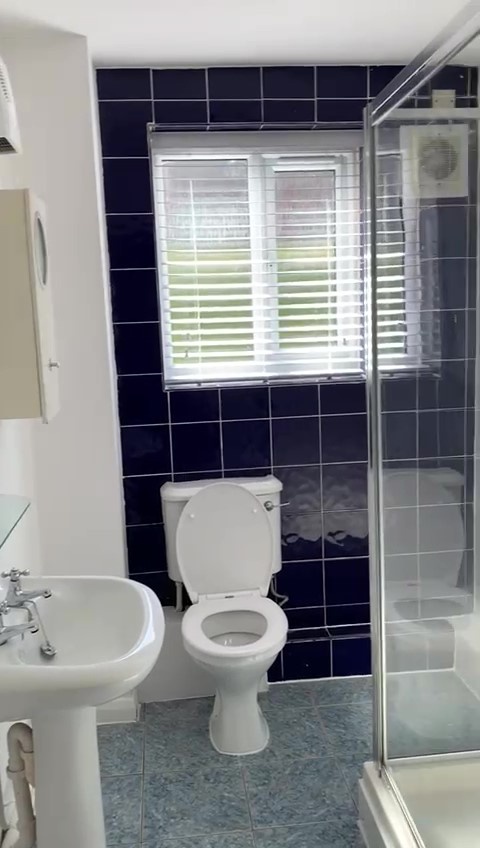 - Fitted suite comprising fully tiled shower cubicle with electric shower, pedestal wash basin and low level WC (white suite) . Part tiled wall and ceramic tiled floor, wall mounted extractor fan, wall mounted fan heater, and window with obscured glass to the rear.