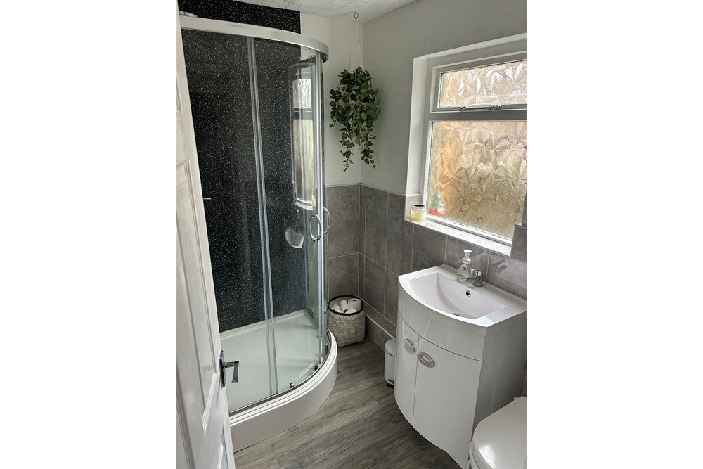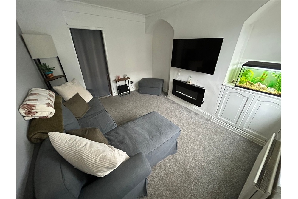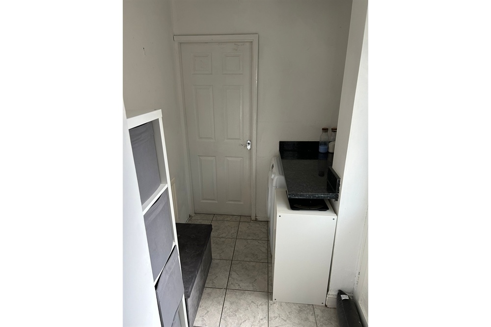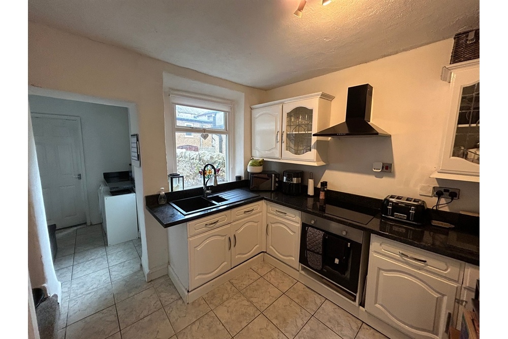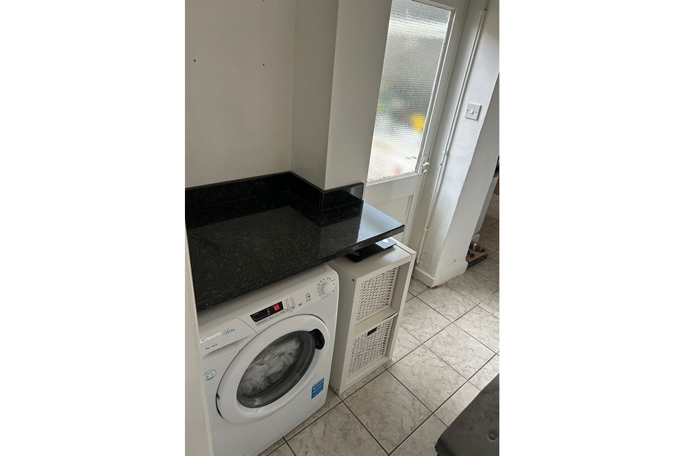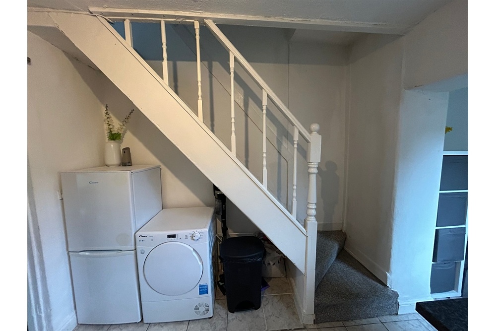 uPVC double-glazed door leads out to the rear yard. UPVC double glazed windows to side and rear elevations. The kitchen is fitted with a range of wall and base units with wood effect cupboard doors and black laminate worktop. Stainless steel sink and drainer with mixer tap. Ideal central heating boiler wall mounted. Space for washing machine space. Freestanding fridge freezer. Freestanding electric oven and 4 ring hob. Ceiling light point. Grey coloured tile effect vinyl flooring. Radiator. Door opens into under stairs storage cupboard.