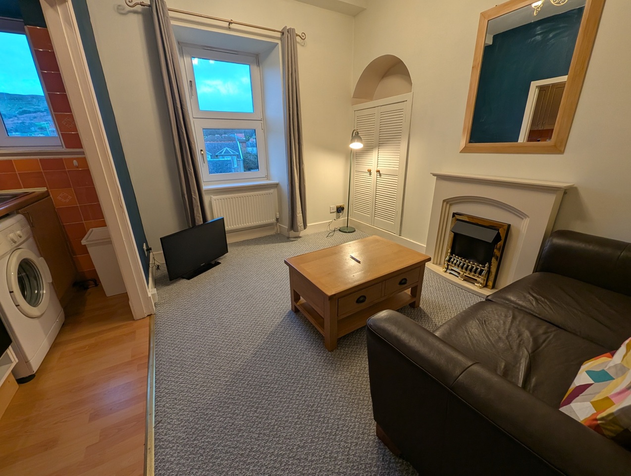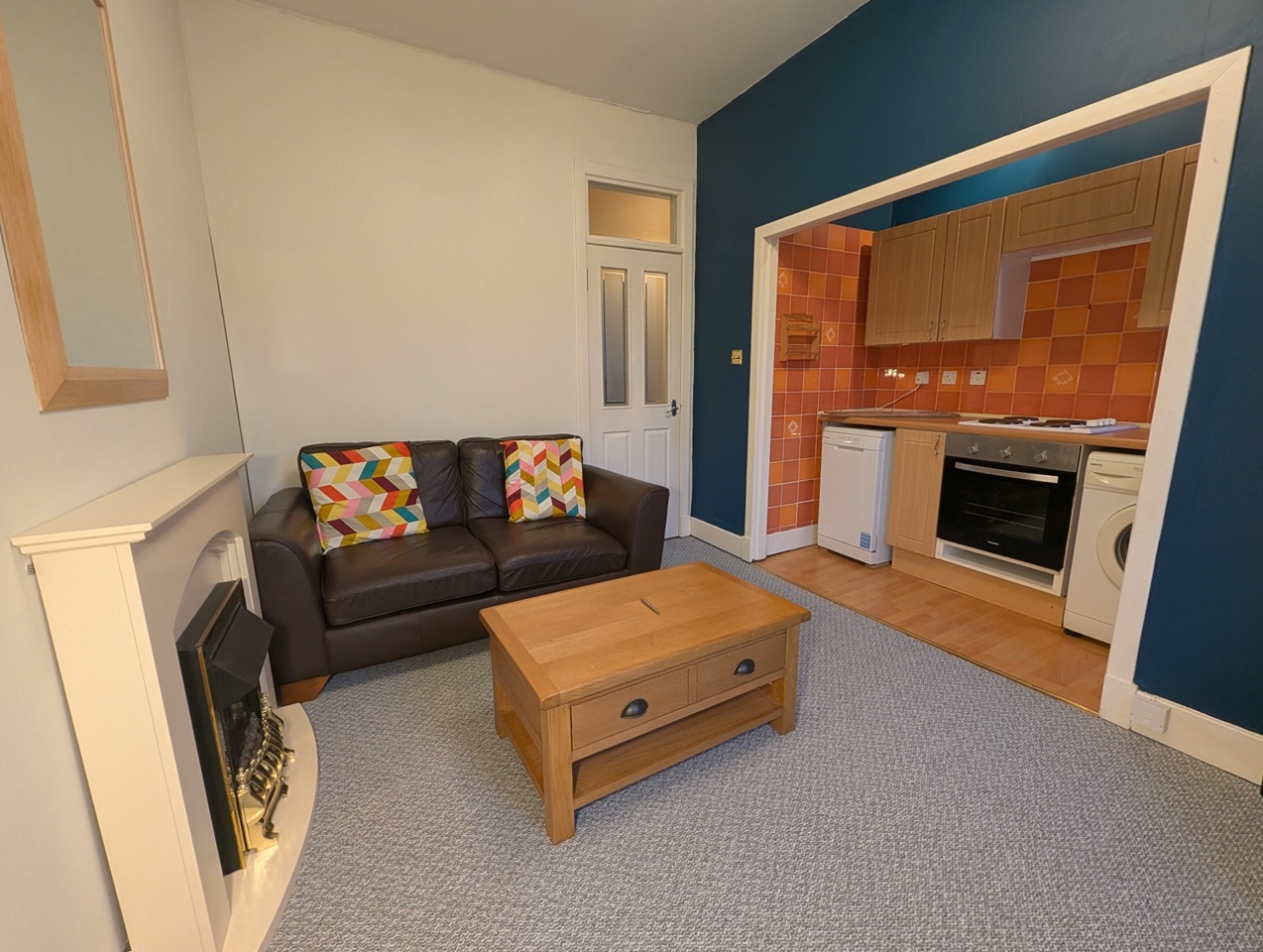 The communal secure entrance and stairway lead to the apartment’s reception hallway, which opens into a rear-facing lounge with an archway that connects the lounge to the semi open-plan kitchen, featuring an integrated electric oven and hob, plus a washing machine and fridge with ice box