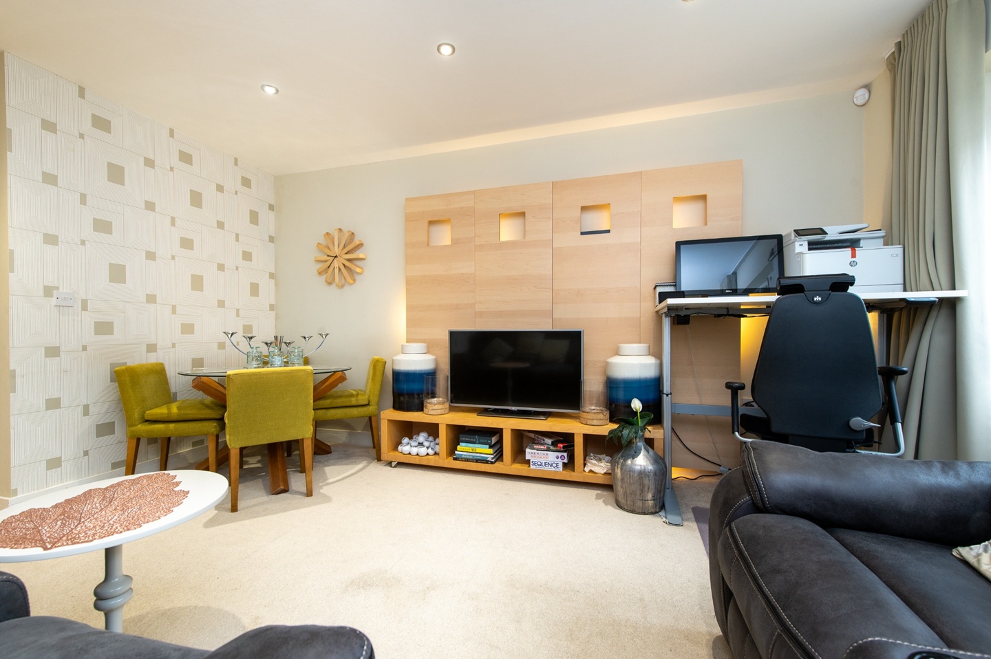 Sophisticated Living SpacesStep into a thoughtfully curated interior featuring a spacious open-plan lounge and dining area bathed in natural light. With plush seating, a Smart TV, elegant furnishings and tasteful décor throughout, the space is perfect for both relaxing and entertaining.