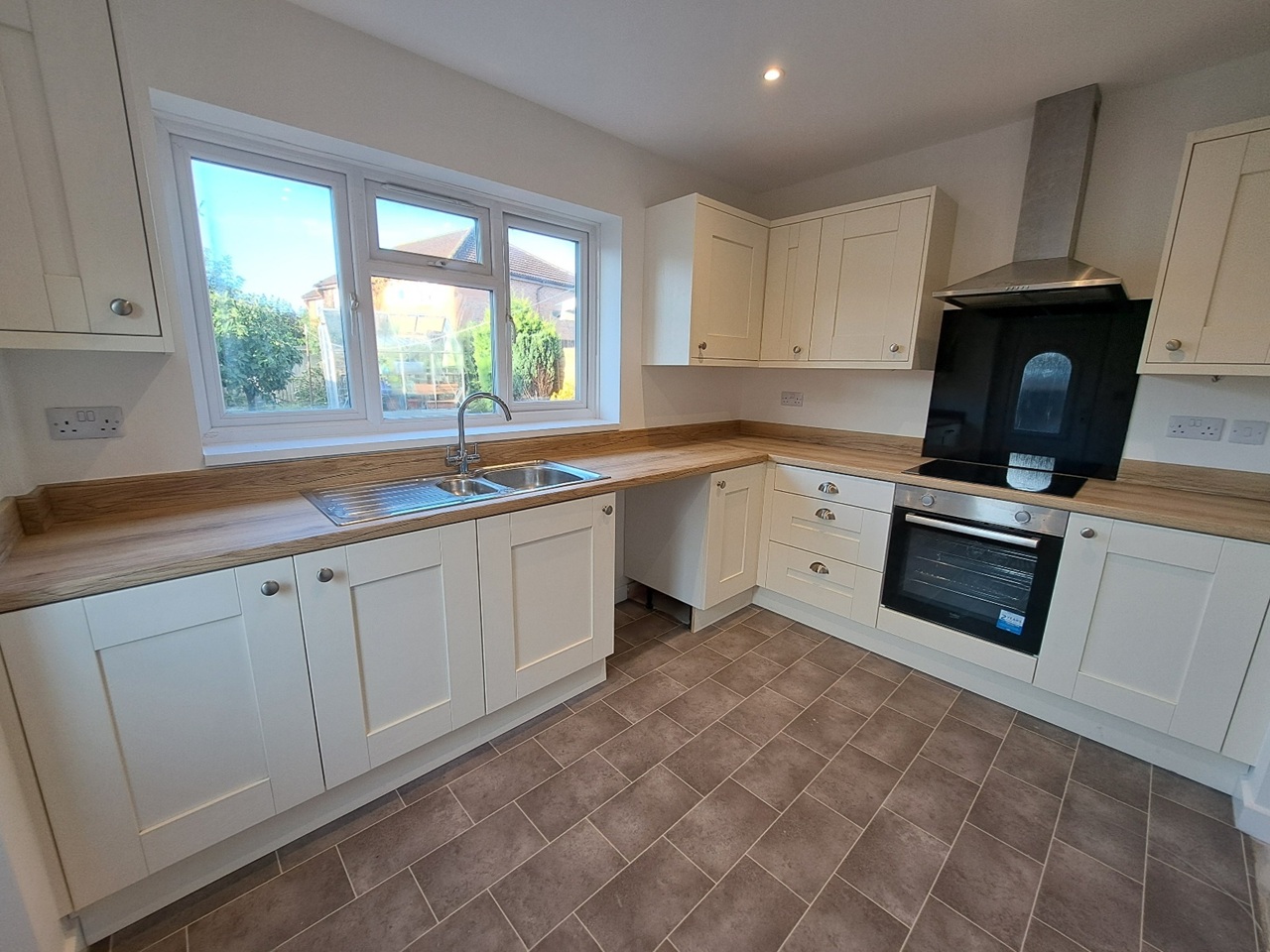 Newly fitted Shaker style cream units with stainless steel sink, built-in oven, 4 ring electric hob with extractor above. Double glazed window to rear with outlook over garden and double glazed door to side.