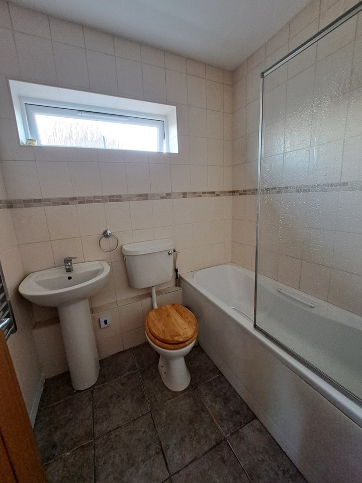 Refitted with a white suite comprising a panelled bath with shower attachment and fitted shower screen, wash basin and a WC. Ladder radiator and double glazed window to side.
