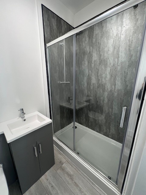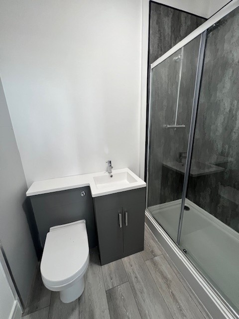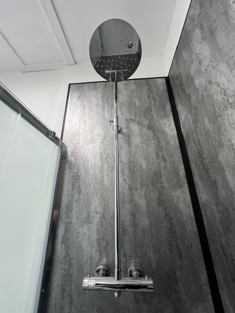 The spacious double bedroom area continues the loft aesthetic and offers a calm, comfortable retreat, while the contemporary bathroom is finished to a high standard with modern fittings throughout.
