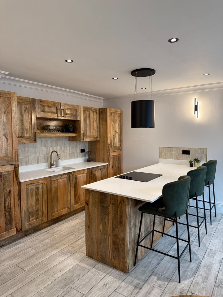 The Open-Plan Kitchen/Living space is large, fully furnished with a new L-shaped sofa, and features a functional kitchen island. The space boasts solid mango wood kitchen and furniture, complemented by modern black accents and fittings, and benefits from a quartz worktop. Includes an Integrated Washer Dryer and Dishwasher.