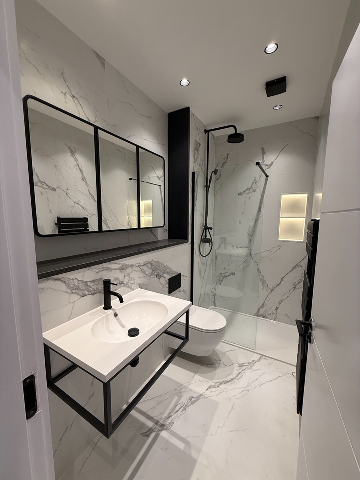 High-Spec En-Suite: Modern bathroom with a crisp black and white aesthetic, and is fully tiled. Features include a mirror that doubles as a storage cabinet, a recessed built-in shelf installed into the shower wall for accessories, and underfloor heating.