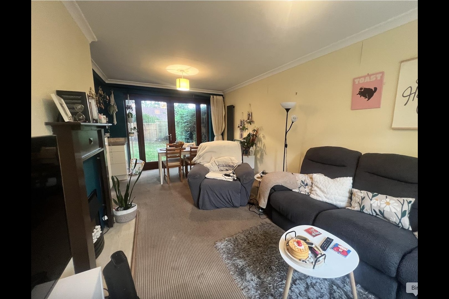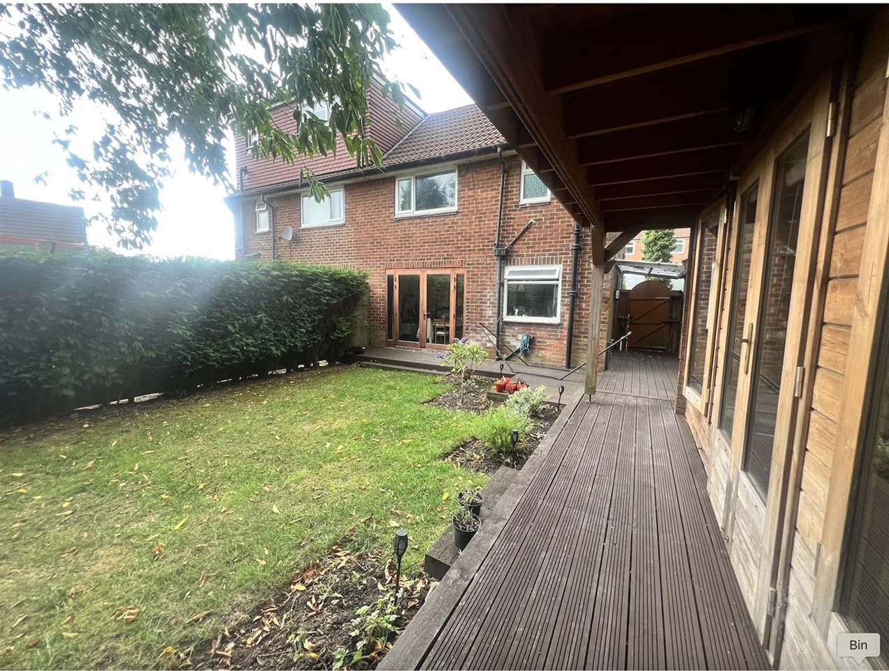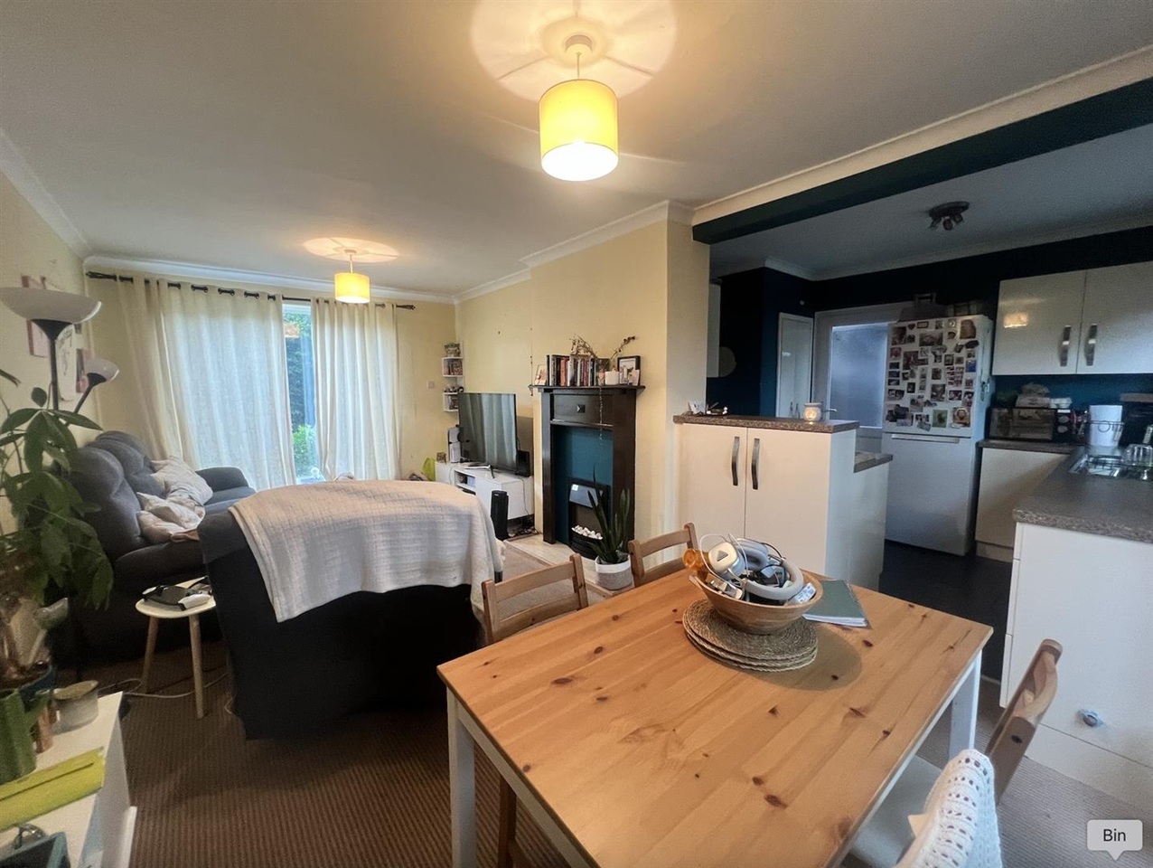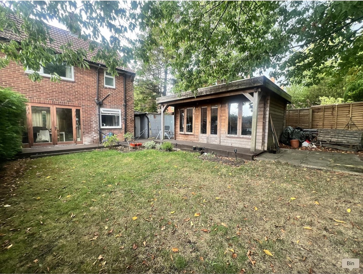 The ground floor features a stylish open-plan kitchen and living area, with large patio doors that flood the space with natural light and lead directly into a generously sized garden. The garden includes a neat lawn and a fantastic cabin house with its own electricity supply ideal as a children’s playroom, home office, or creative studio.