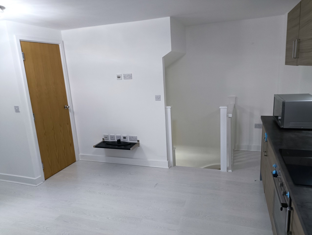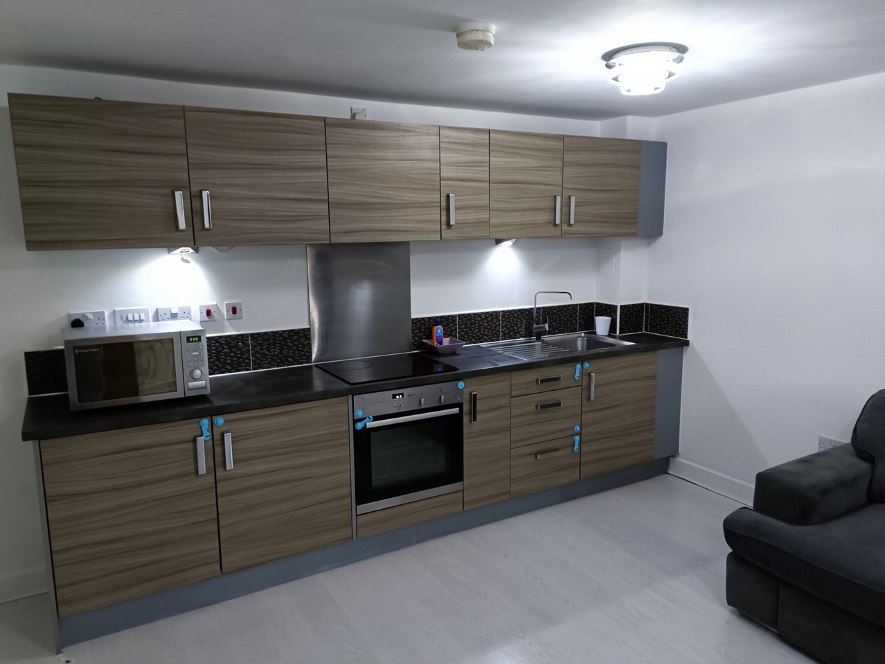 The open plan living space is a good size and incorporates a modern kitchen - with integrated appliances, including an electric oven, hob and extractor - all finished off with complementary stone grey granite effect worktops.
