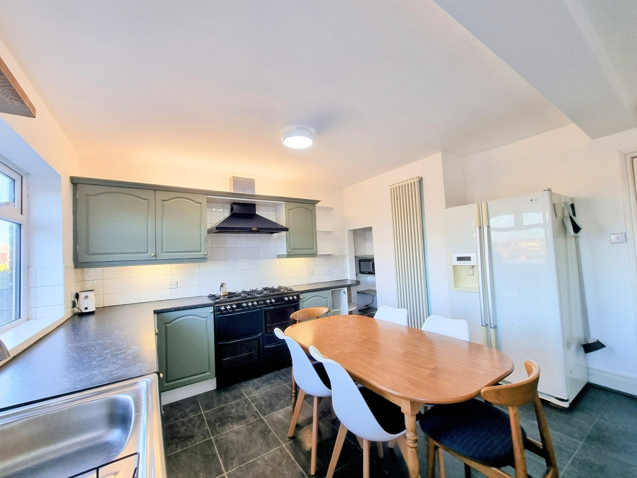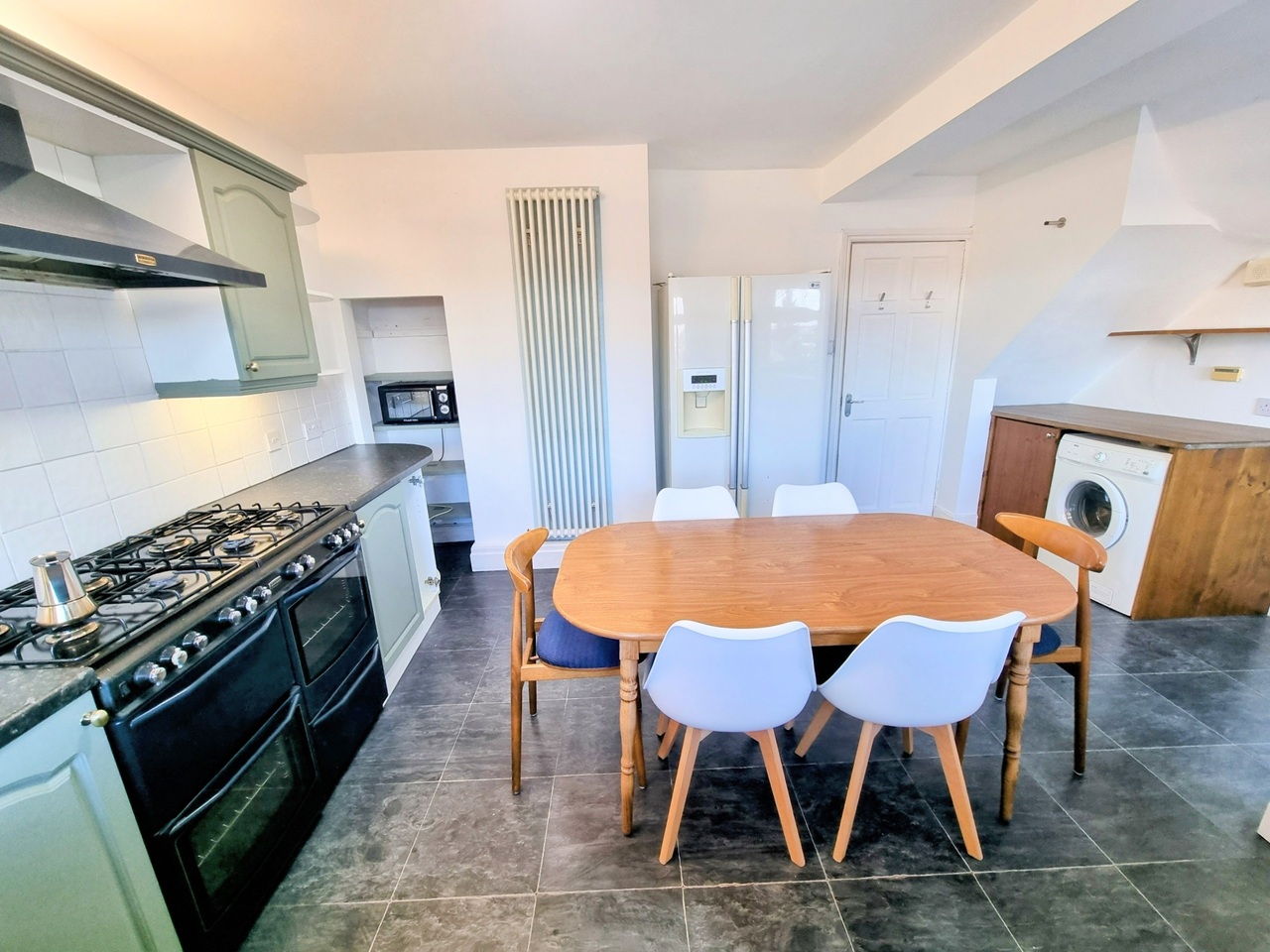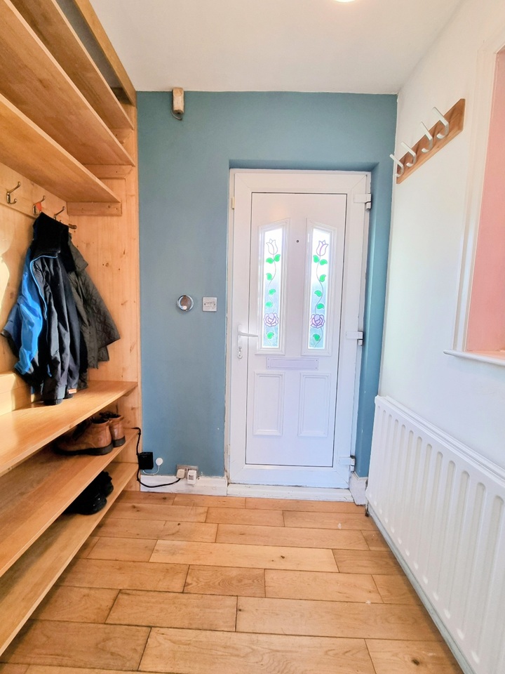 The ground floor features a spacious lounge with a fireplace, a bespoke TV/shoe-rack/coat-hanger unit, and a large double-glazed bay window to the front, filling the room with natural light. The modern kitchen/diner is fitted with a comprehensive range of wall and base units with complimentary work surfaces over, and comes fully equipped with a dishwasher, washing machine, large American-style fridge/freezer, and a large 8-burner gas cooker. There’s plenty of space for a family dining table and chairs — perfect for entertaining or everyday family meals. A useful storage lean-to provides ample additional storage space.