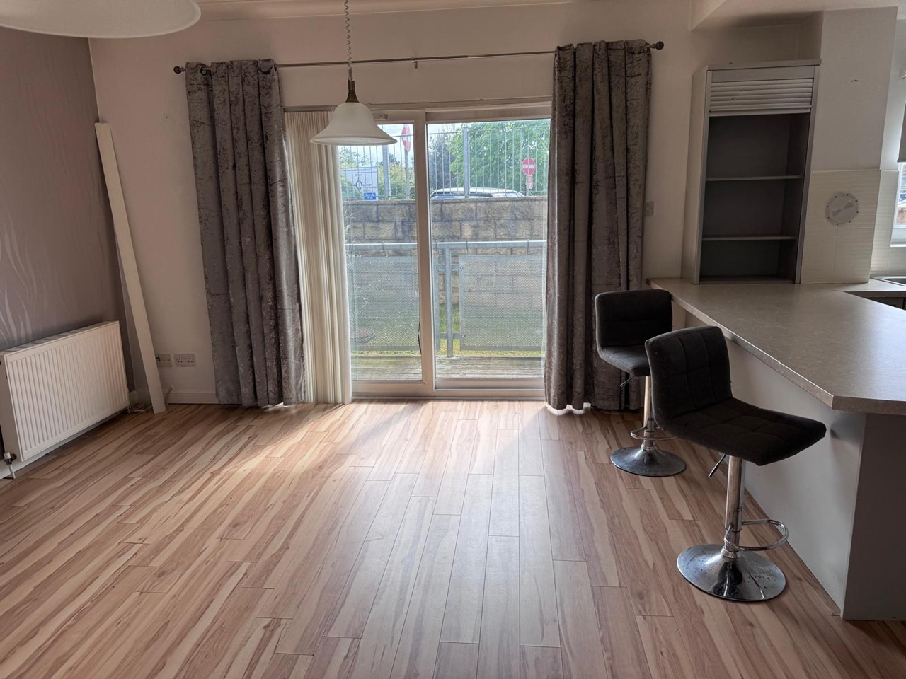 Upon entry, the spacious hallway, decorated in neutral tones, features sleek wood-effect flooring that flows seamlessly throughout the home. The heart of the property is the open-plan kitchen, dining, and living space, perfect for both relaxation and entertaining. The modern kitchen is fitted with light grey cabinetry, complimented by white work surfaces and tiles, and comes fully equipped with integrated appliances, including an oven, hob, hood, fridge freezer, microwave, and a freestanding washing machine . An on-trend breakfast bar adds a stylish touch and separates the kitchen from the neutral-toned living area, which is bathed in natural light thanks to French doors that open onto a South-facing balcony, ideal for enjoying the sunshine all day long.