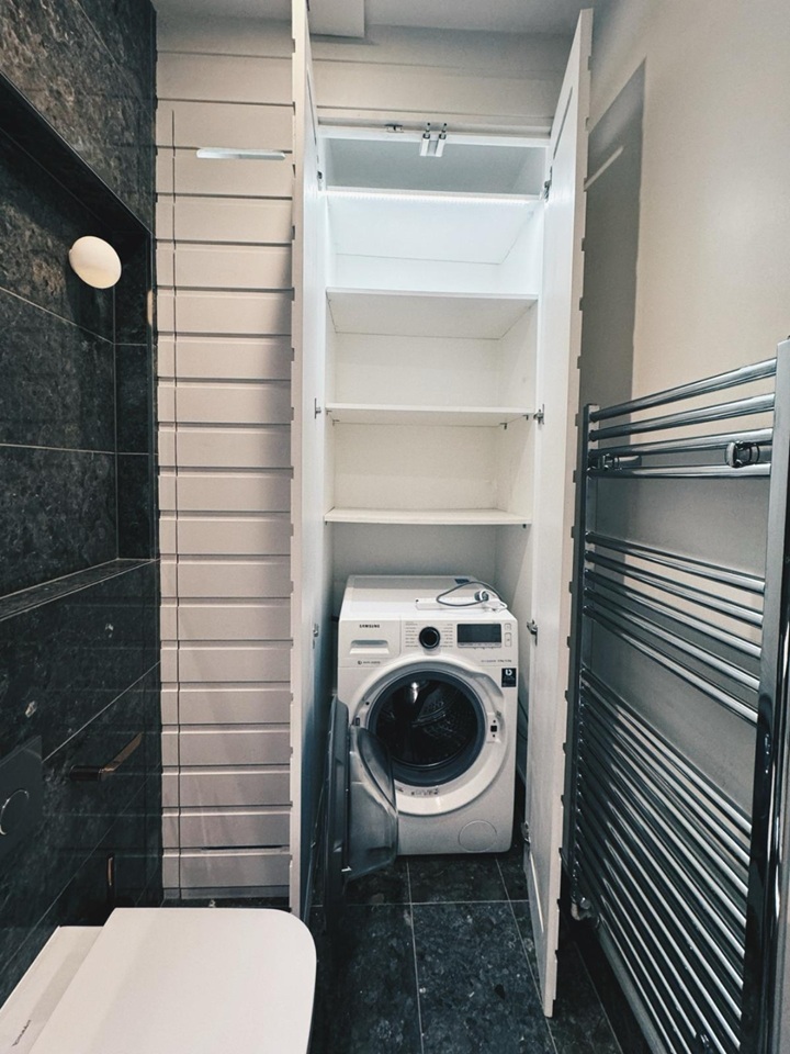 Designed to maximise space, functionality and storage, the apartment features an open-plan reception and kitchen area with integrated appliances, sleek cabinetry, and generous room for both relaxing and entertaining. An extendable coffee/dining table allows you to easily host friends and family, while clever storage solutions help keep the space clutter-free.
