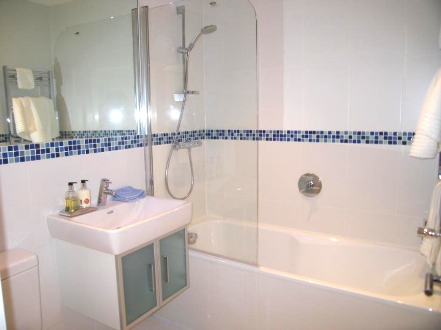 Modern tiled bathroom with bath and shower