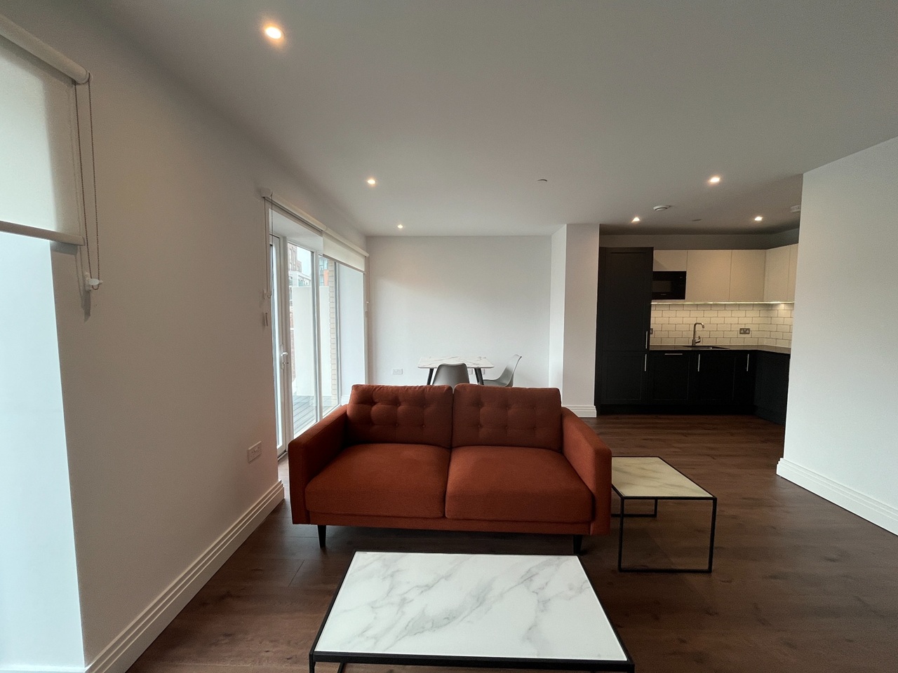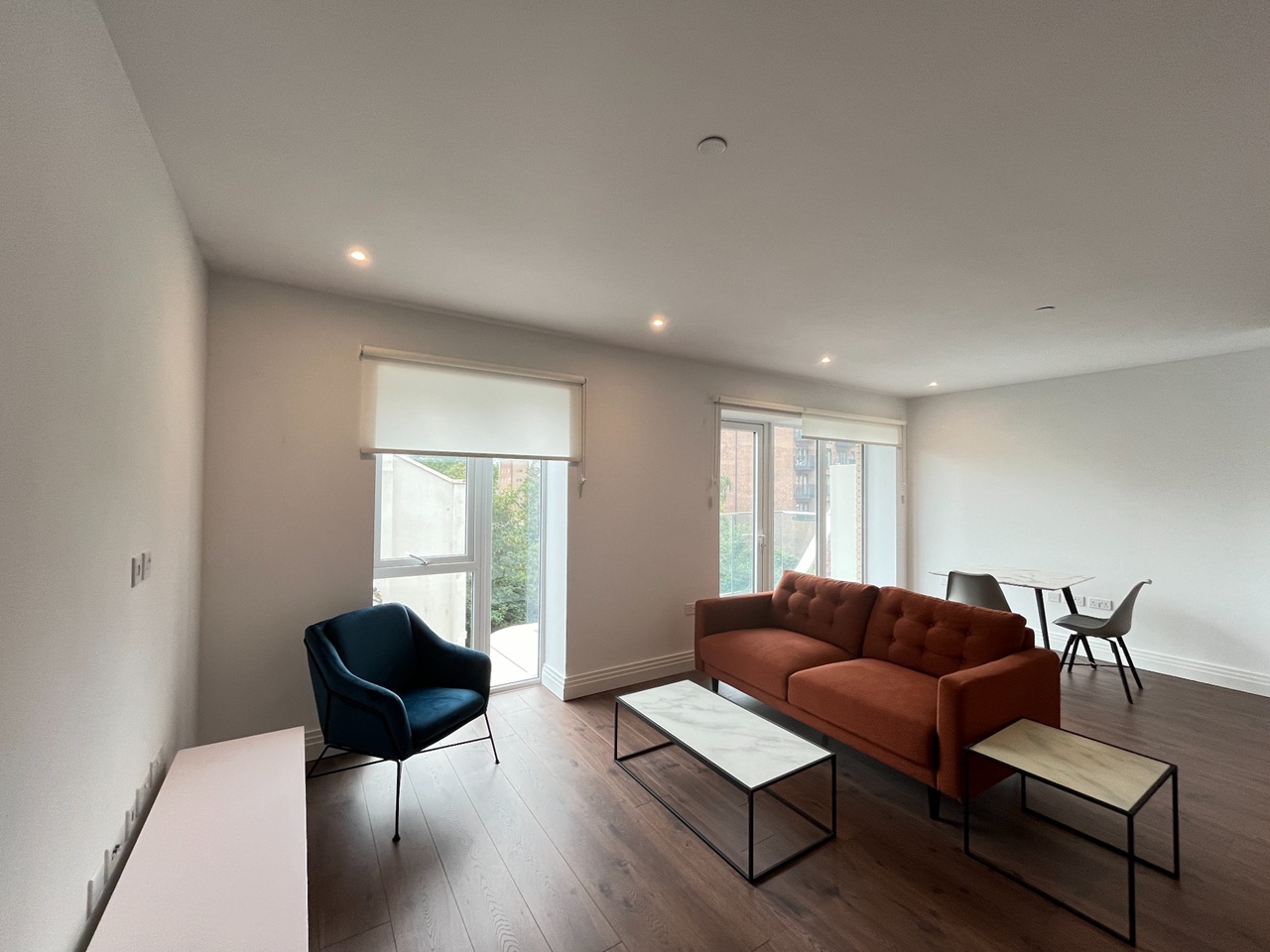 A spacious open-plan living and dining area with floor-to-ceiling windows providing excellent natural light