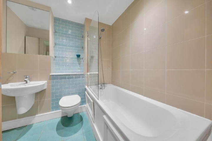 The double bedroom is well-proportioned and quiet, with a large built in wardrobe. The modern bathroom includes a full-size bath with shower, contemporary tiling and built-in shelving and storage.