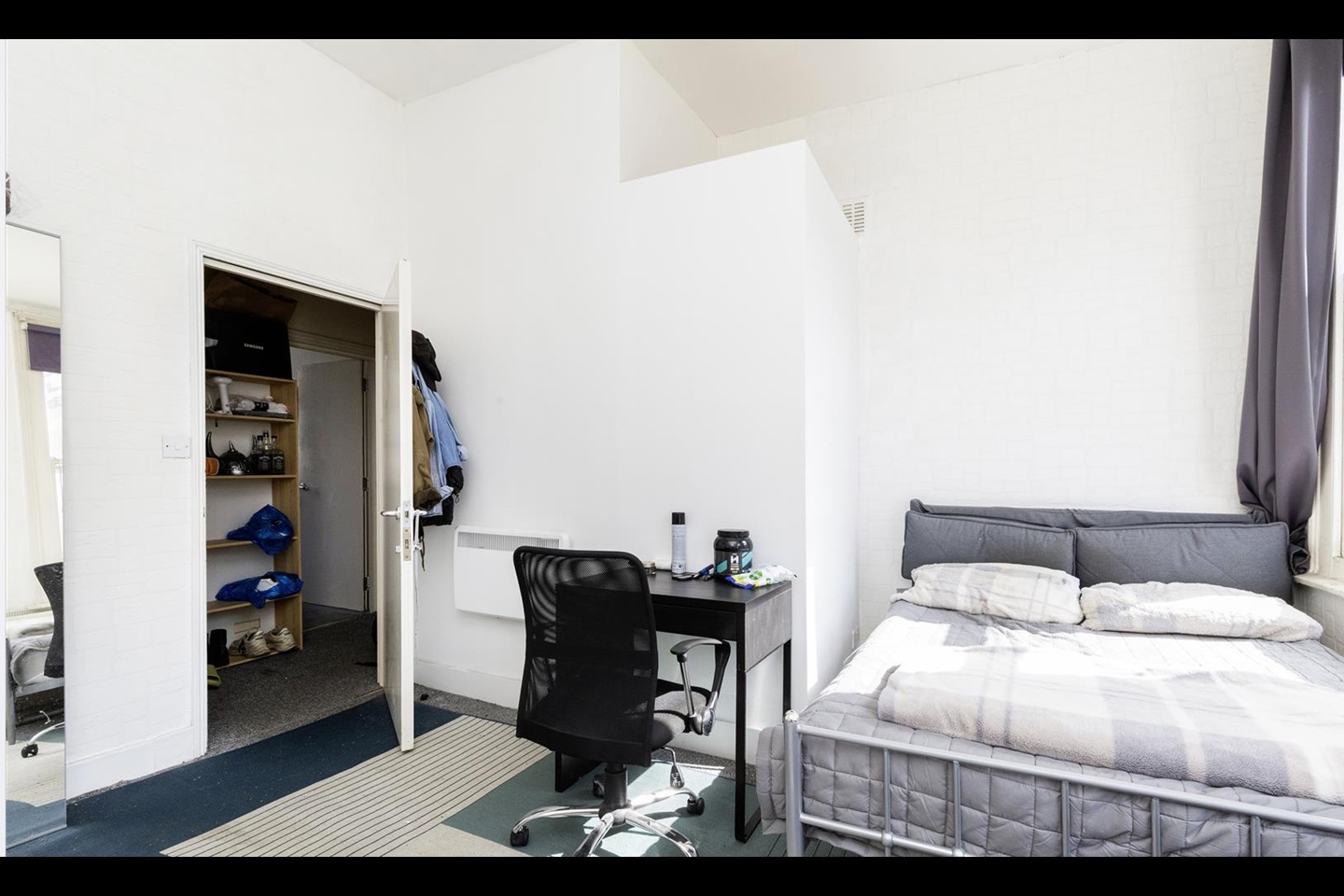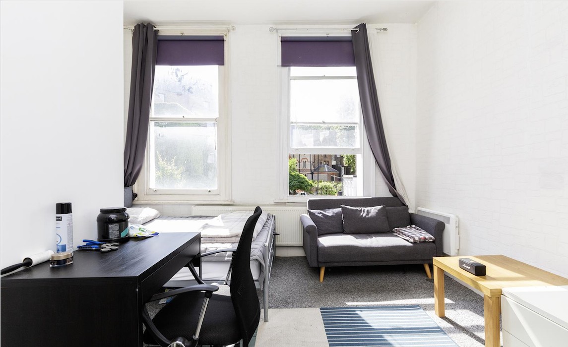 The flat features a spacious open-plan living/sleeping area, a fully fitted kitchen, and a modern private bathroom. With neutral décor and large windows providing plenty of natural light, this studio offers both comfort and convenience.