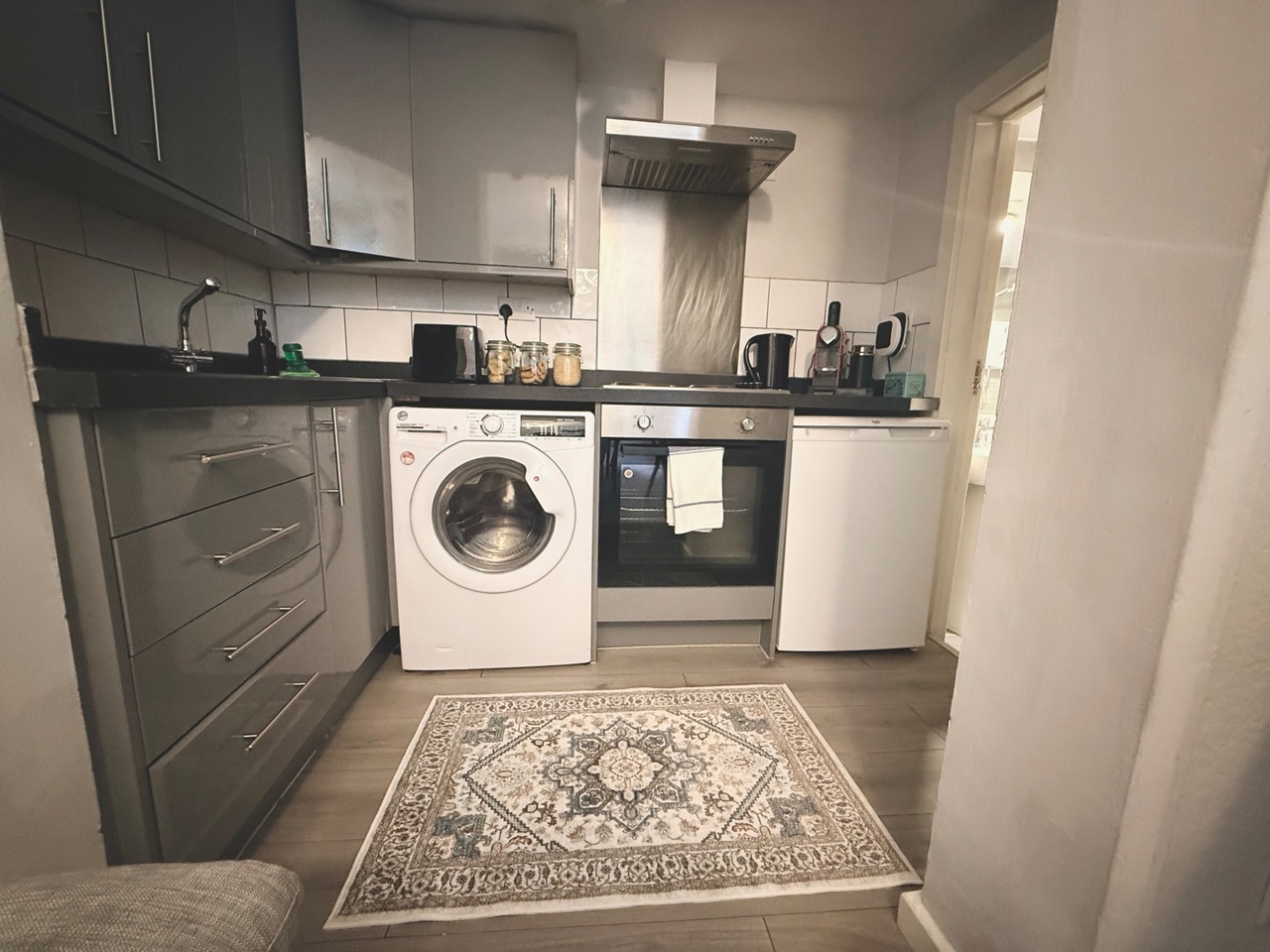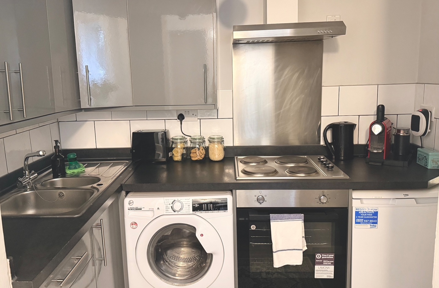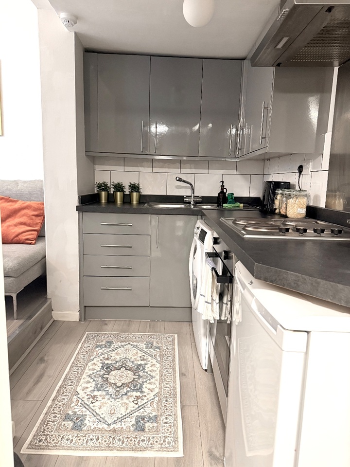 The kitchen is fully equipped with basic appliances, cookware, and utensils—everything you need to prepare simple meals. The bathroom includes a shower, sink, toilet, fresh towels, and complimentary toiletries.