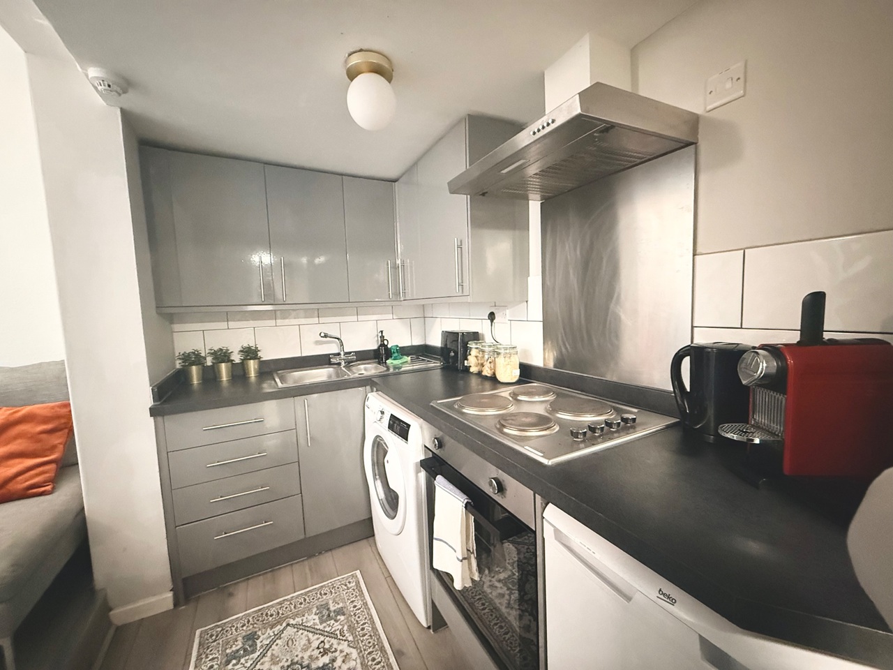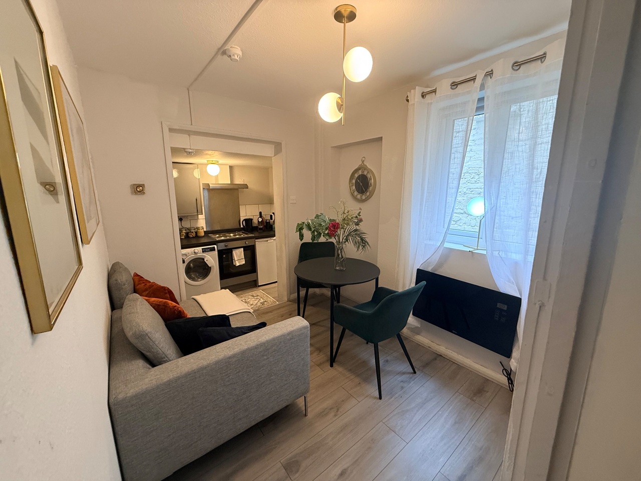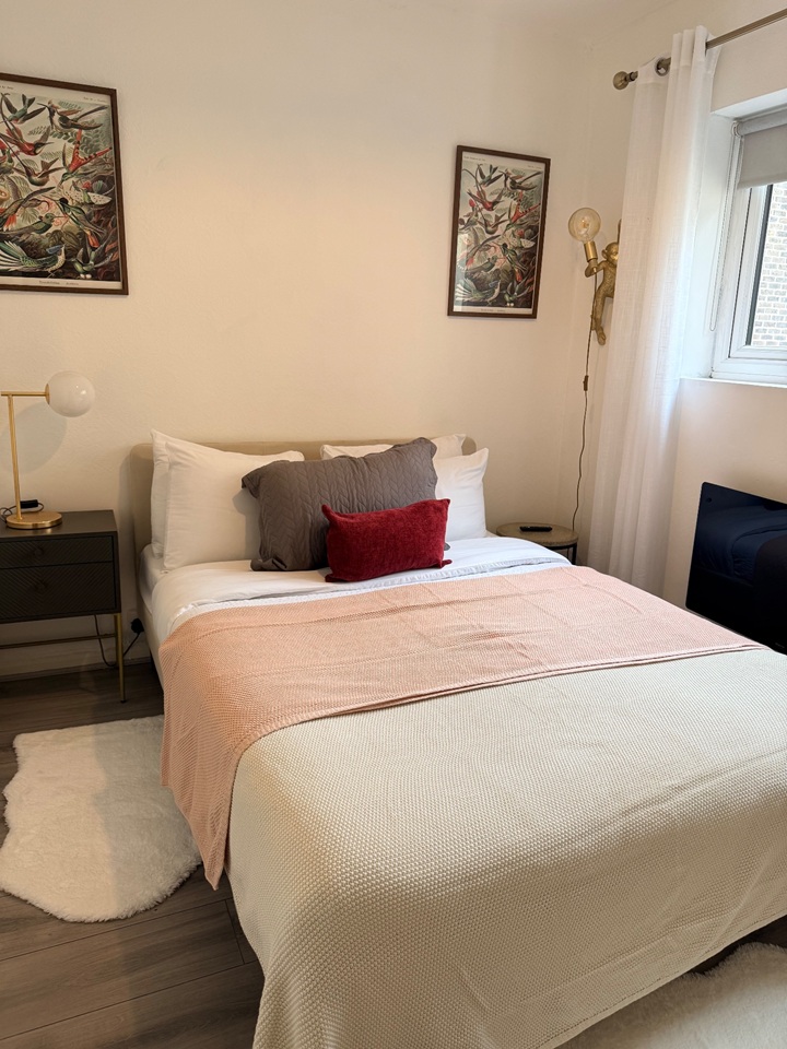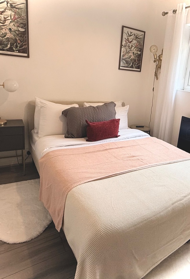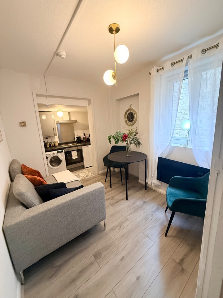 The flat features one bedroom with a double bed. The living area includes a sofa, dining table, and flat-screen TV—perfect for relaxing after a day in the city.