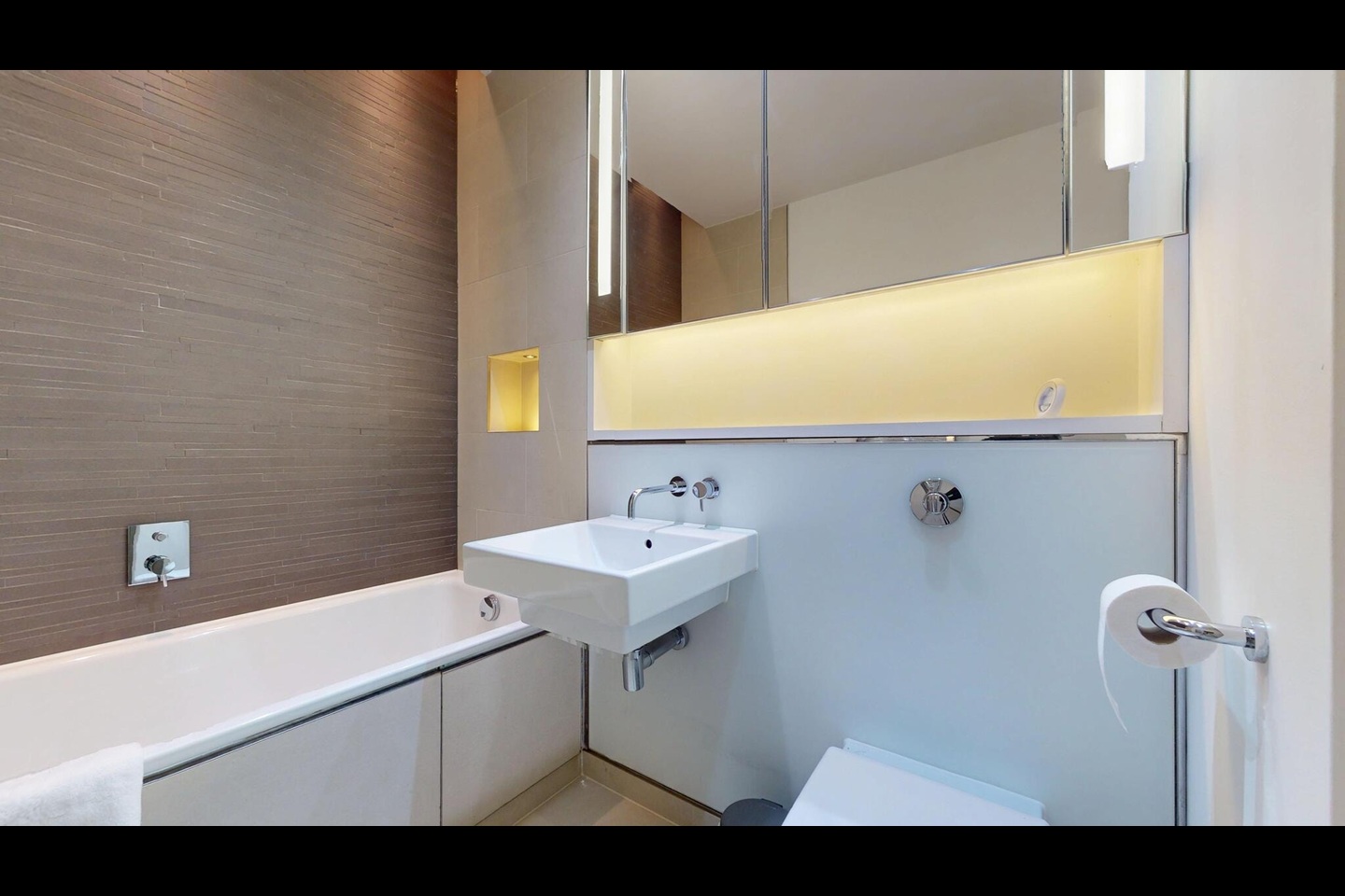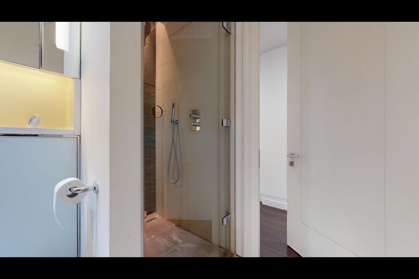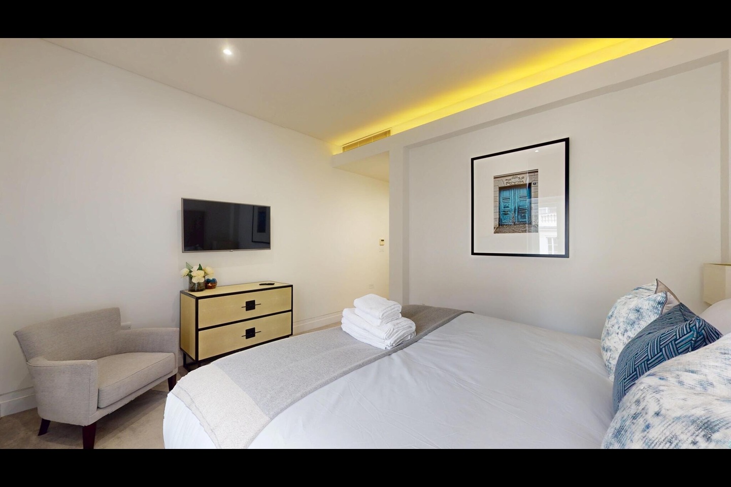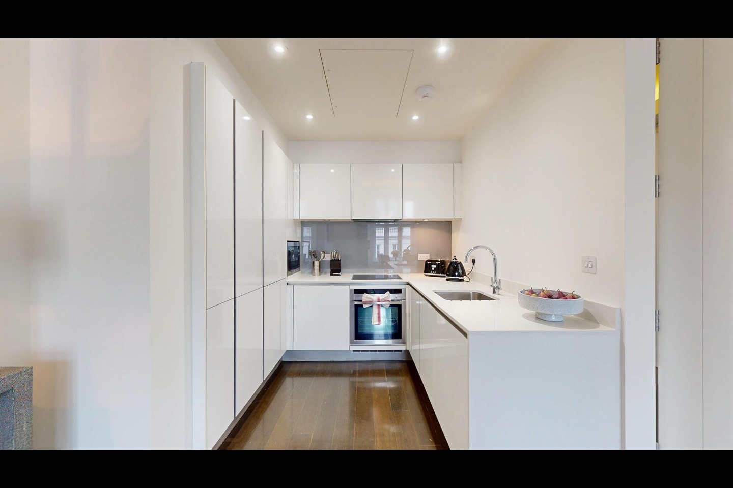 The spacious double bedroom includes fitted wardrobes, while the apartment is further enhanced by a sleek contemporary bathroom, a separate guest cloakroom, and excellent storage throughout.