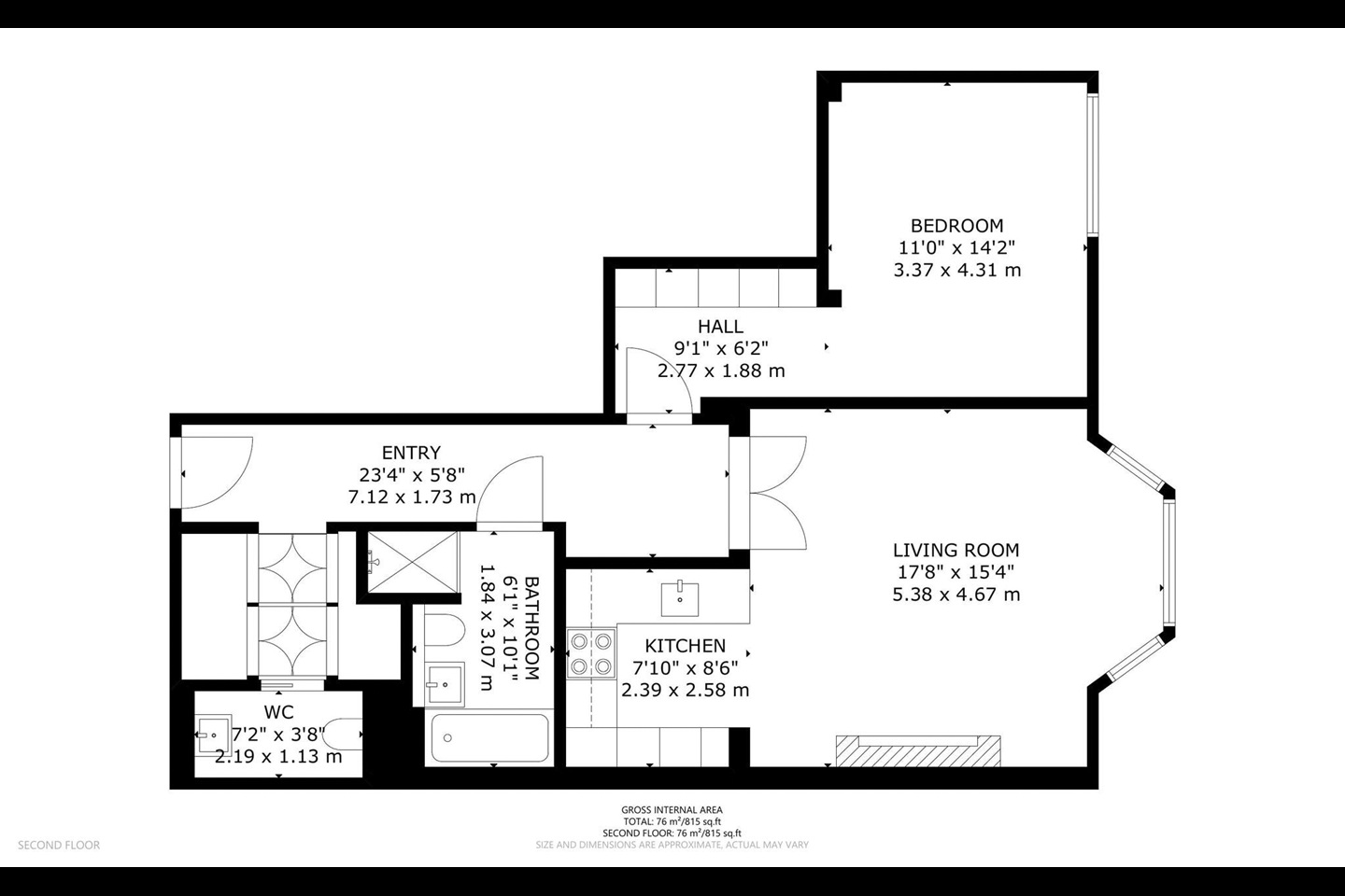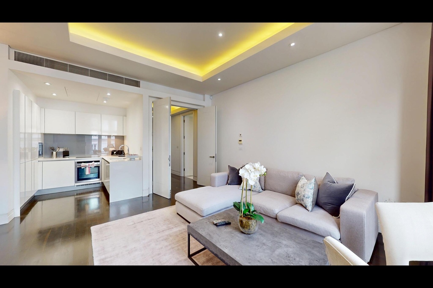 Extending to approximately 821 sq ft, the apartment is generously proportioned and thoughtfully laid out. The impressive open-plan reception and kitchen area features high ceilings and striking bay windows, flooding the space with natural light and offering views towards North Audley Street. The modern fitted kitchen is seamlessly integrated, creating an ideal setting for both entertaining and everyday living.