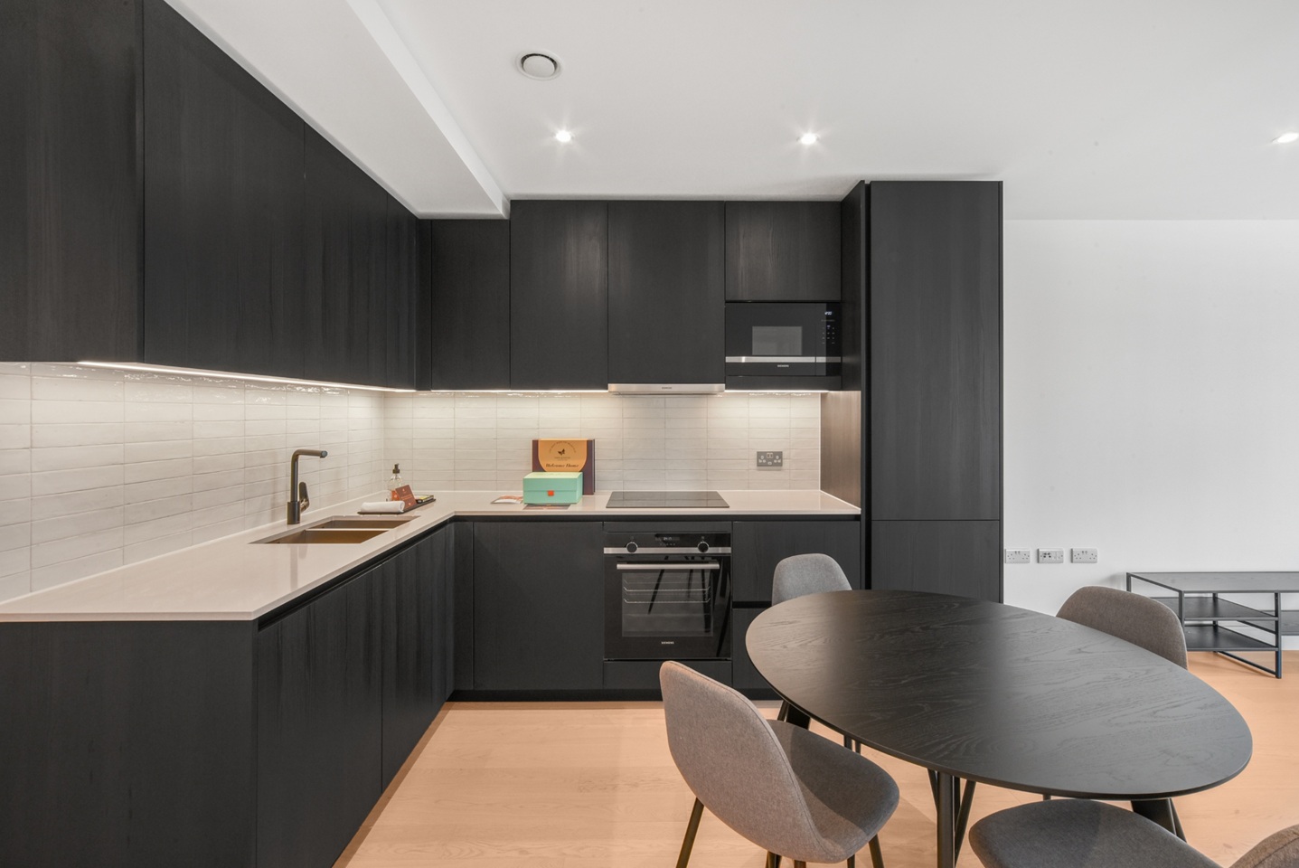 Stunning one-bedroom apartment in the sought-after Park & Sayer development at Elephant Park, SE17. Boasting an open-plan living area/kitchen with fully integrated appliances, extending onto a balcony with views, a bedroom with a built-in wardrobe, and a modern bathroom. Key features include engineered wood flooring, underfloor heating, custom kitchen cabinetry, and utility cupboard with a washer/dryer.