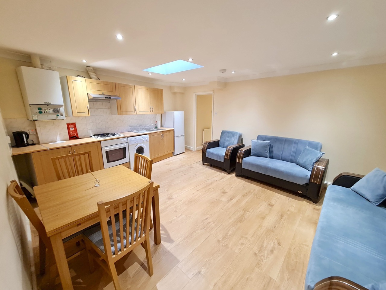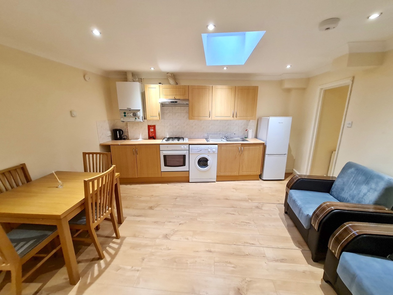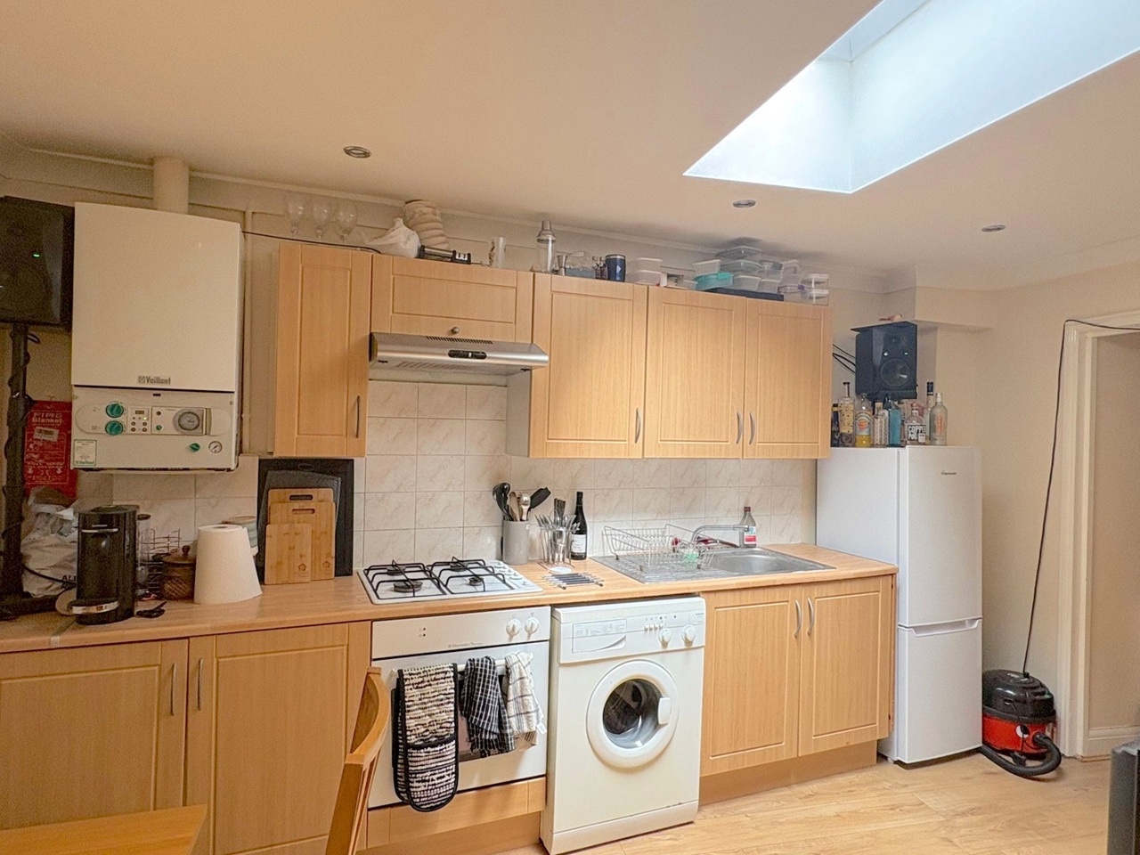- The modern kitchen is fully equipped with washing machine, fridge and freezer plus all essential appliances.