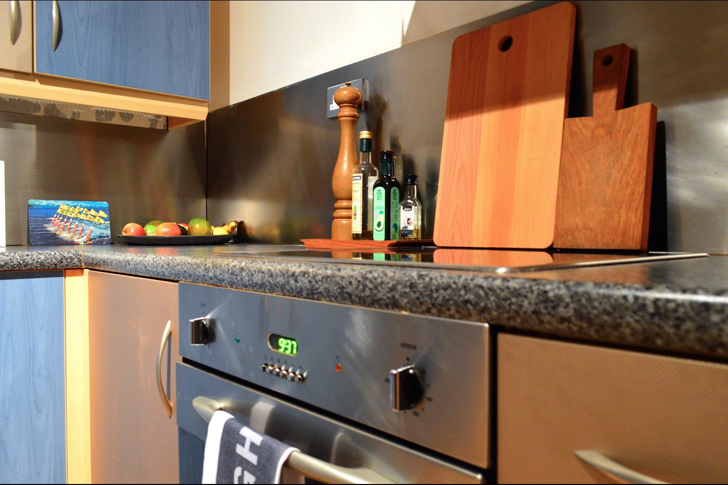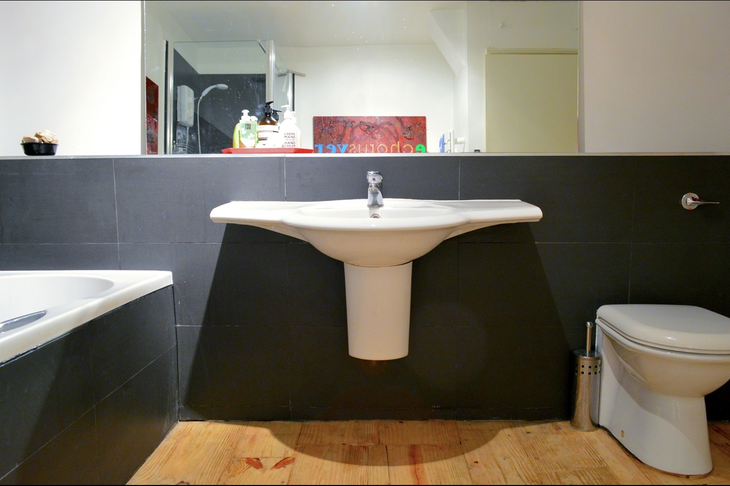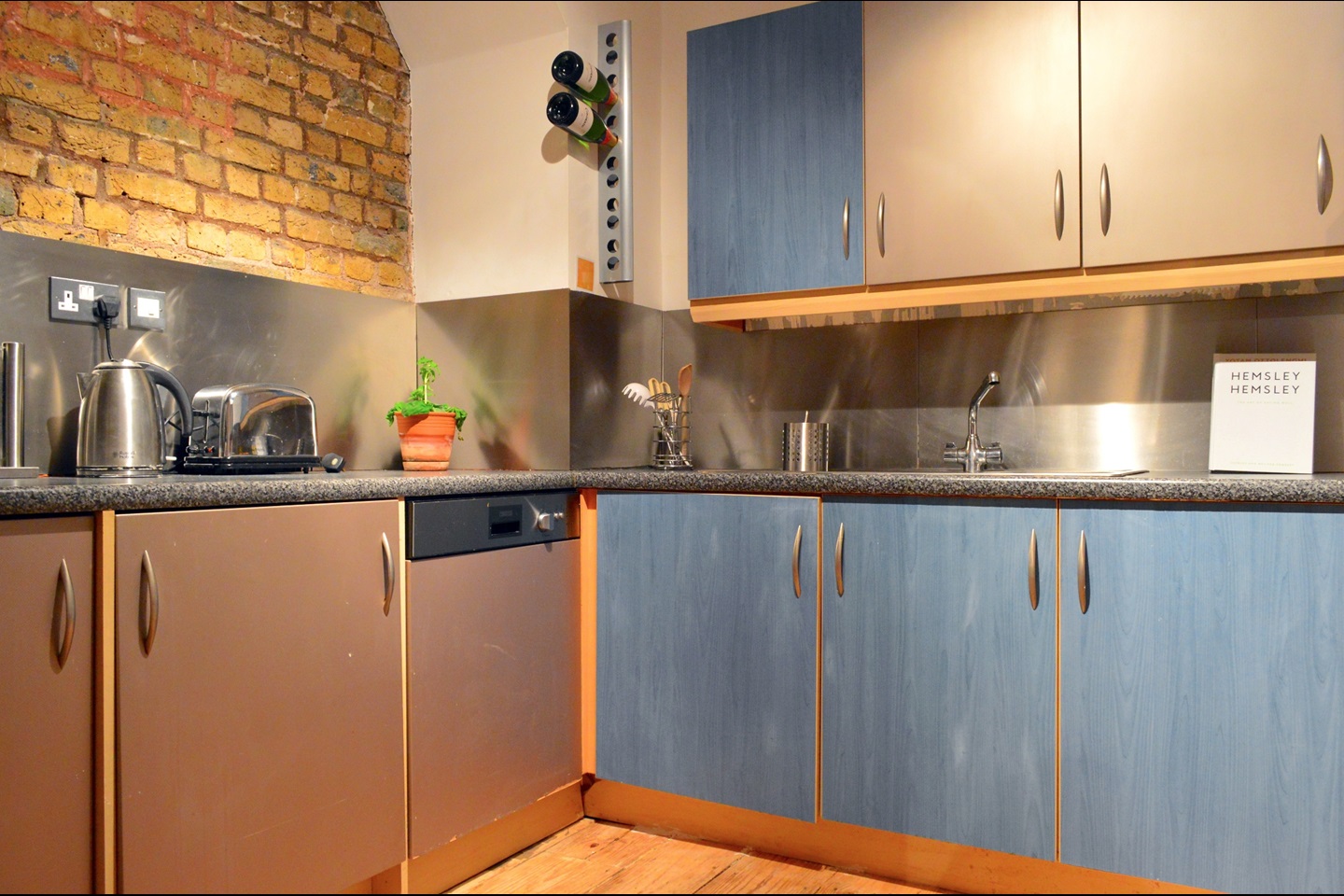 The living room is the jewel in the crown but the flat also has an impressive oblong bedroom with walk-in wardrobe and glass bricks which serve as the wall next to the entrance/ante-chamber. The bathroom has a shower and a separate bath. The kitchen comes with washer/dryer, dishwasher, fridge, freezer, oven and electric hobs.