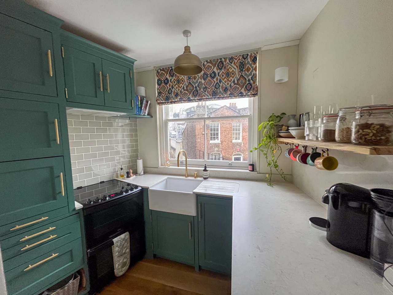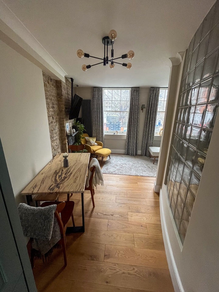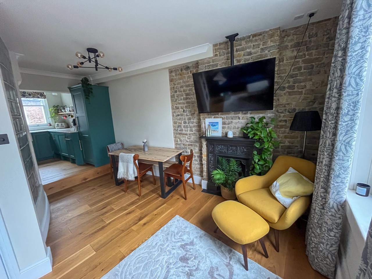The living space is warm and stylish, featuring exposed brickwork above the original Victorian fireplace, creating a beautiful mix of traditional character and modern design. A handmade, wooden dining table with matching bench, custom-built for the space, will remain in the property and is ideal for hosting.